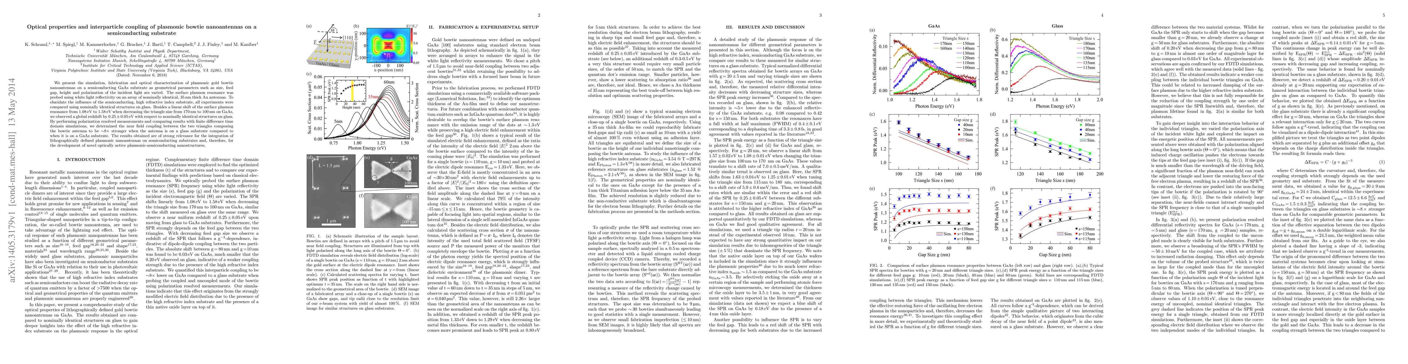 We present the simulation, fabrication and optical characterization of plasmonic gold bowtie nanoantennas on a semiconducting GaAs substrate as geometrical parameters such as size, feed gap, height and polarization of the incident light are varied. The surface plasmon resonance was probed using white light reflectivity on an array of nominally identical, 35nm thick Au antennas. To elucidate the influence of the semiconducting, high refractive index substrate, all experiments were compared using nominally identical structures on glass. Besides a linear shift of the surface plasmon resonance from 1.08eV to 1.58eV when decreasing the triangle size from 170nm to 100nm on GaAs, we observed a global redshift by 0.25 +- 0.05eV with respect to nominally identical structures on glass. By performing polarization resolved measurements and comparing results with finite difference time domain simulations, we determined the near field coupling between the two triangles composing the bowtie antenna to be 8x stronger when the antenna is on a glass substrate compared to when it is on a GaAs substrate. The results obtained are of strong relevance for the integration of lithographically defined plasmonic nanoantennas on semiconducting substrates and, therefore, for the development of novel optically active plasmonic-semiconducting nanostructures.