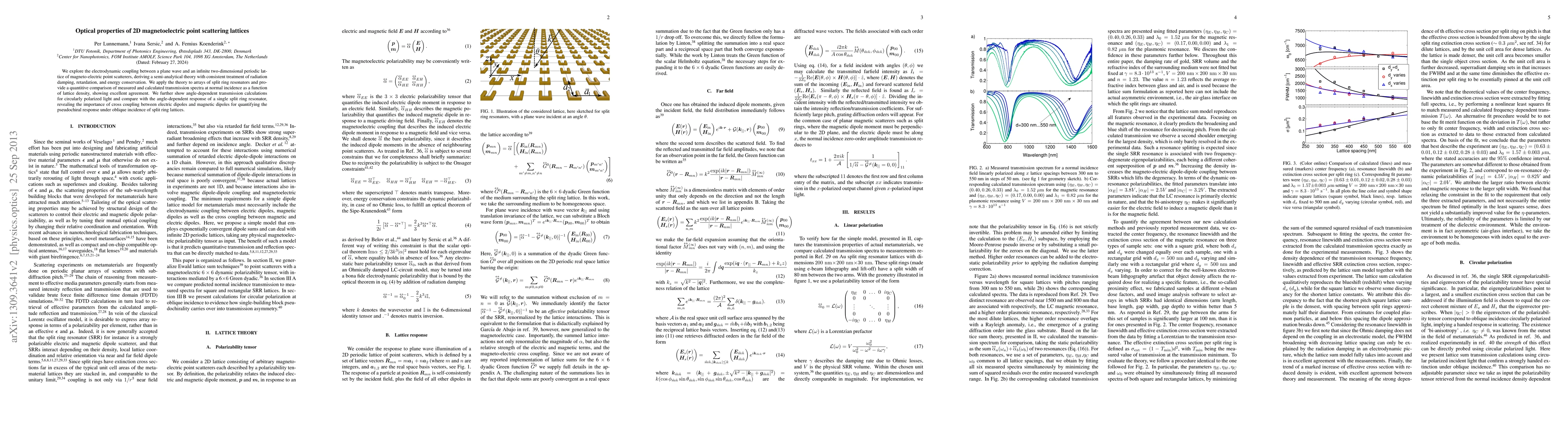 This research presents a semi-analytical theory for electrodynamic coupling in 2D magneto-electric point scattering lattices, accounting for radiation damping, retardation, and energy conservation. The theory is validated by comparing measured and calculated transmission spectra for split-ring resonator arrays, demonstrating excellent agreement. Angle-dependent calculations for circularly polarized light reveal the significance of cross coupling between electric and magnetic dipoles in pseudochiral response of split-ring lattices under oblique incidence.