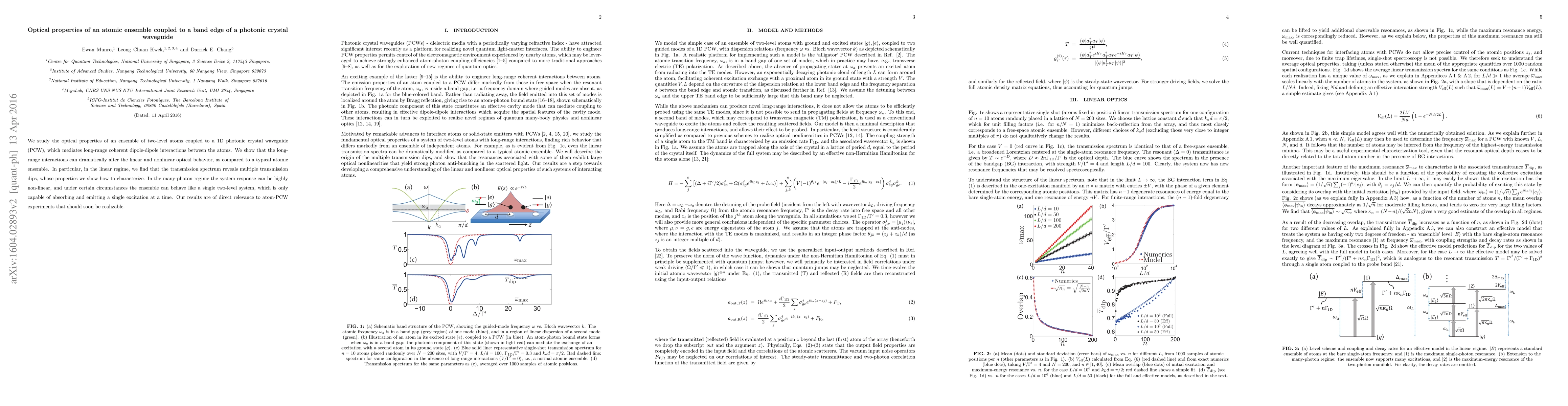 This paper investigates how an ensemble of two-level atoms coupled to a 1D photonic crystal waveguide alters the optical properties, revealing multiple transmission dips in the linear regime and highly non-linear behavior in the many-photon regime, where the ensemble can act like a single two-level system. These findings are significant for upcoming atom-PCW experiments.