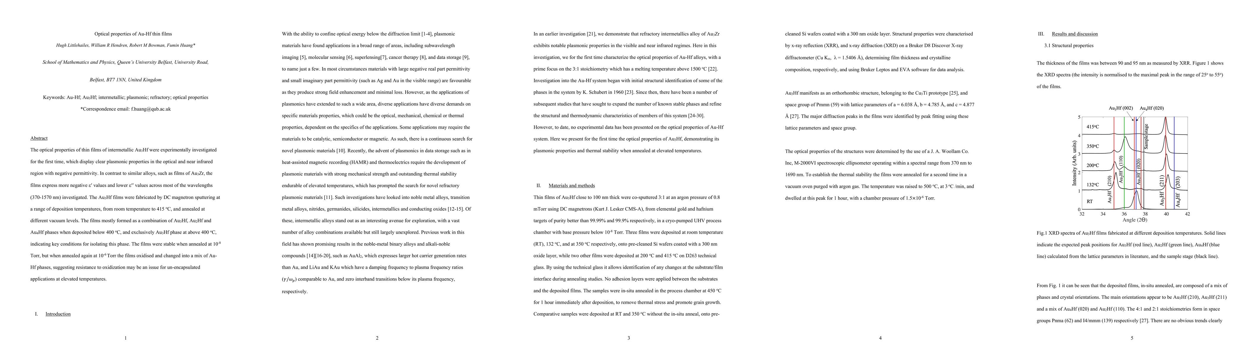 The optical properties of thin films of intermetallic Au$_{3}$Hf were experimentally investigated for the first time, which display clear plasmonic properties in the optical and near infrared region with negative permittivity. In contrast to similar alloys, such as films of Au$_{3}$Zr, the films express more negative $\epsilon'$ values and lower $\epsilon''$ values across most of the wavelengths (370-1570 nm) investigated. The Au$_{3}$Hf films were fabricated by DC magnetron sputtering at a range of deposition temperatures, from room temperature to 415$^{o}$C, and annealed at different vacuum levels. The films mostly formed as a combination of Au$_{3}$Hf, Au$_{2}$Hf and Au$_{4}$Hf phases when deposited below 400$^{o}$C, and exclusively Au$_{3}$Hf phase at above 400$^{o}$C, indicating key conditions for isolating this phase. The films were stable when annealed at 10$^{-8}$ Torr, but when annealed again at 10$^{-6}$ Torr the films oxidised and changed into a mix of Au- Hf phases, suggesting resistance to oxidization may be an issue for un-encapsulated applications at elevated temperatures.