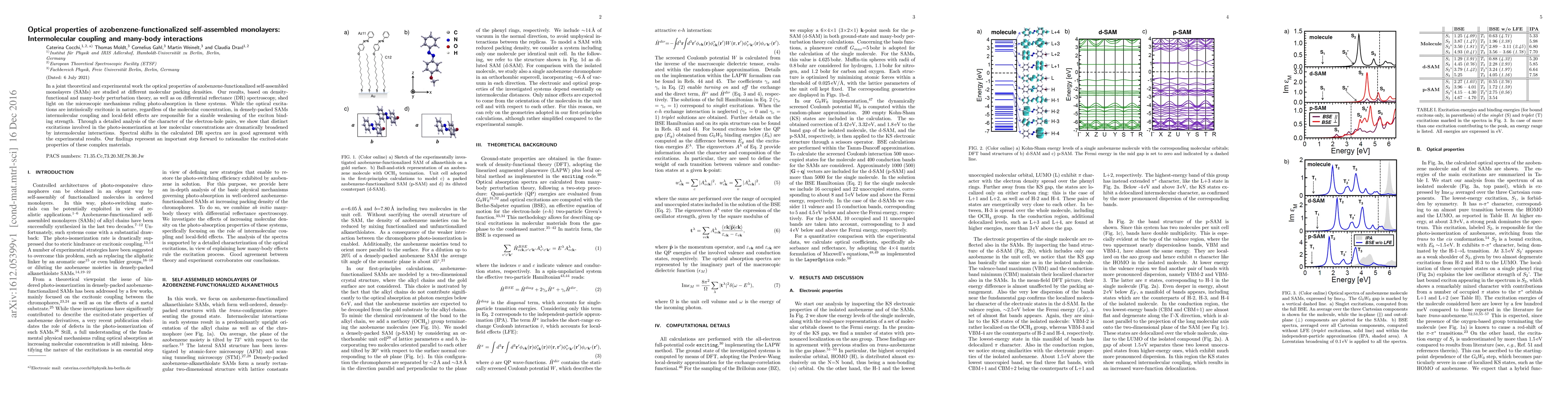 In a joint theoretical and experimental work the optical properties of azobenzene-functionalized self-assembled monolayers (SAMs) are studied at different molecular packing densities. Our results, based on density-functional and many-body perturbation theory, as well as on differential reflectance (DR) spectroscopy, shed light on the microscopic mechanisms ruling photo-absorption in these systems. While the optical excitations are intrinsically excitonic in nature, regardless of the molecular concentration, in densely-packed SAMs intermolecular coupling and local-field effects are responsible for a sizable weakening of the exciton binding strength. Through a detailed analysis of the character of the electron-hole pairs, we show that distinct excitations involved in the photo-isomerization at low molecular concentrations are dramatically broadened by intermolecular interactions. Spectral shifts in the calculated DR spectra are in good agreement with the experimental results. Our findings represent an important step forward to rationalize the excited-state properties of these complex materials.