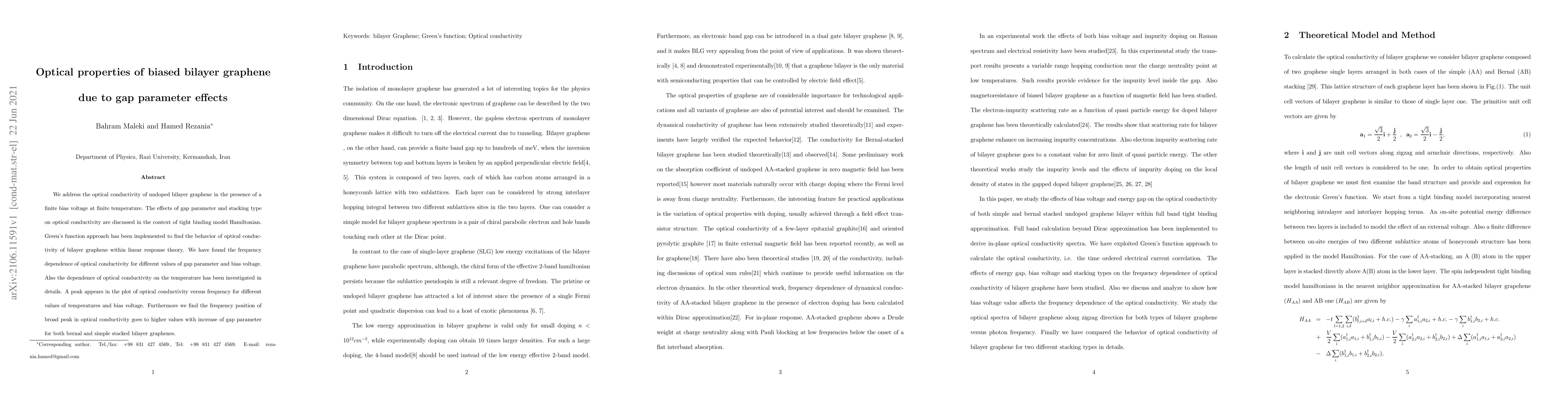 This study investigates the optical conductivity of undoped bilayer graphene under bias voltage, revealing how gap parameters and stacking types influence this conductivity via a tight binding model. The findings indicate that the optical conductivity peaks shift to higher frequencies with increased gap parameters, and a peak is observed across various temperatures and bias voltages.