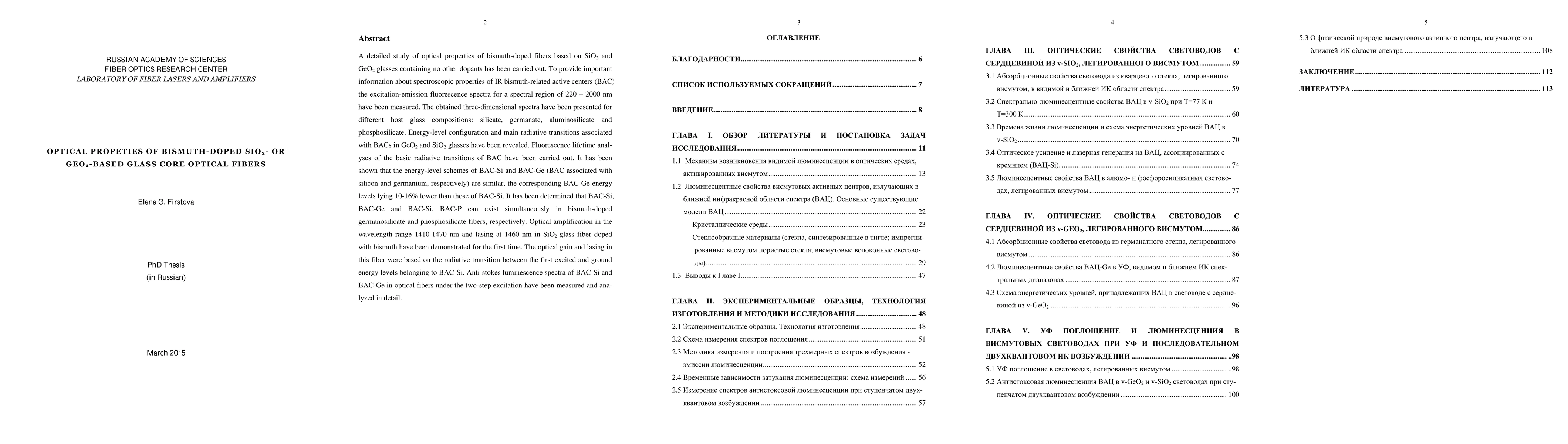 This study investigates the optical properties of bismuth-doped SiO2 and GeO2 glass core optical fibers, revealing similar energy-level schemes for bismuth-related active centers (BAC) in both materials, with GeO2 levels lower. It demonstrates optical amplification and lasing in bismuth-doped SiO2 fibers based on BAC-Si transitions.