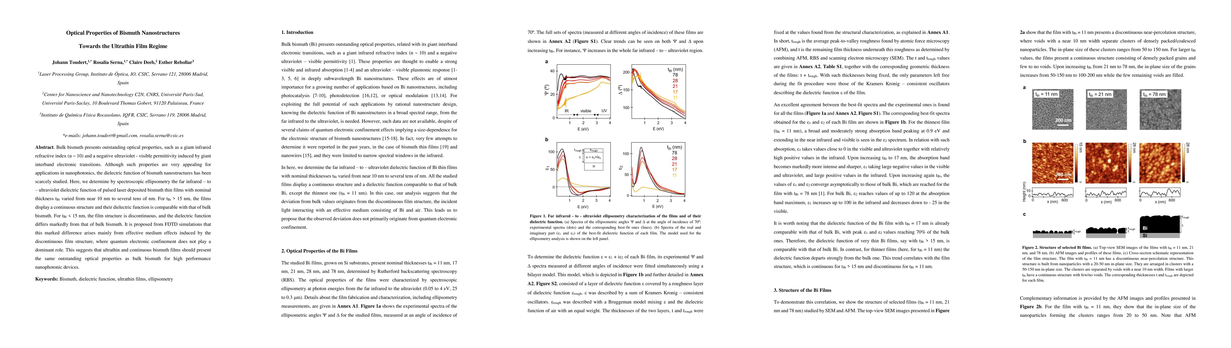 This paper investigates the optical properties of bismuth nanostructures, finding that films above 15 nm maintain bulk-like dielectric functions, while those below 15 nm show significant differences due to discontinuous structures, suggesting potential for high-performance nanophotonic devices with ultrathin, continuous bismuth films.