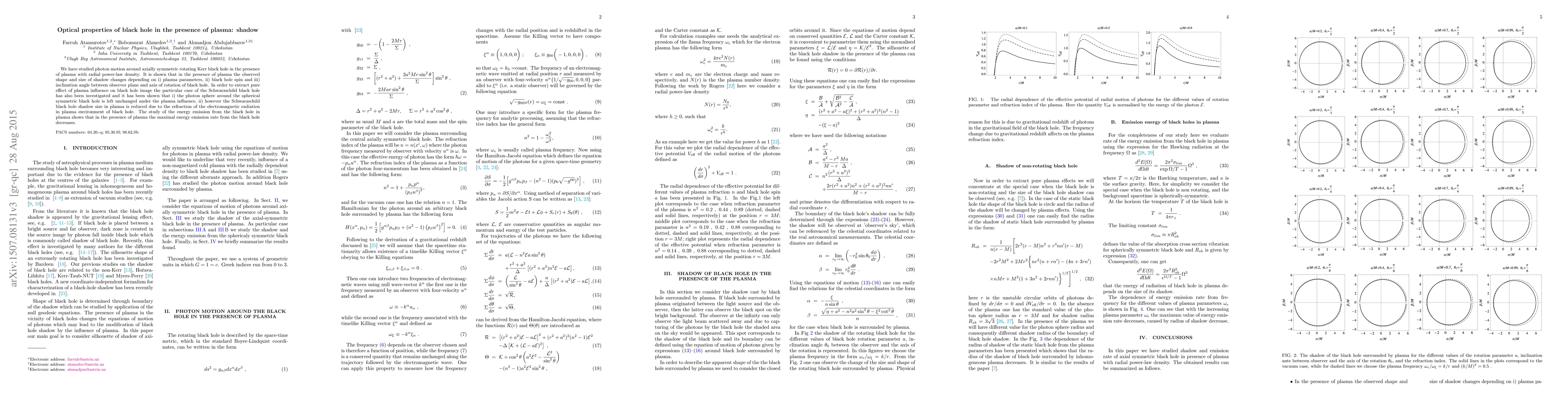 This paper investigates how plasma affects the optical properties of a Kerr black hole, showing that plasma alters the shadow's shape and size based on the plasma parameters, black hole spin, and observer inclination. In contrast, plasma does not change the photon sphere around a Schwarzschild black hole but reduces its shadow size due to electromagnetic refraction.