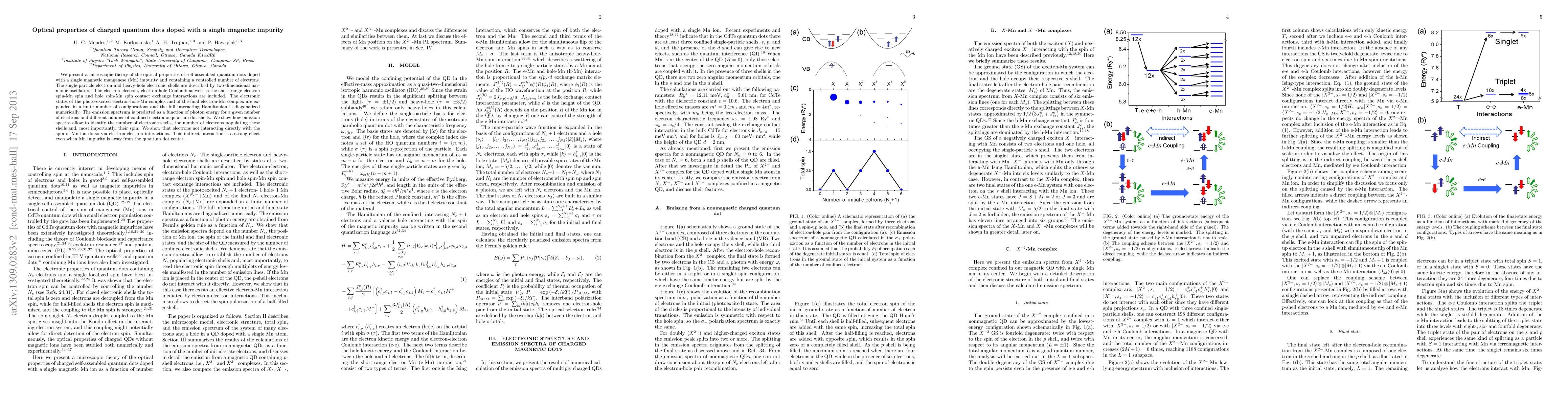 This paper develops a microscopic theory to predict the optical properties of quantum dots doped with a single magnetic manganese impurity, revealing how emission spectra can identify electronic shell configurations, electron counts, and their spin states, even for electrons not directly interacting with the Mn impurity. The study highlights the significant role of indirect electron-electron interactions in determining the quantum dot's optical response.