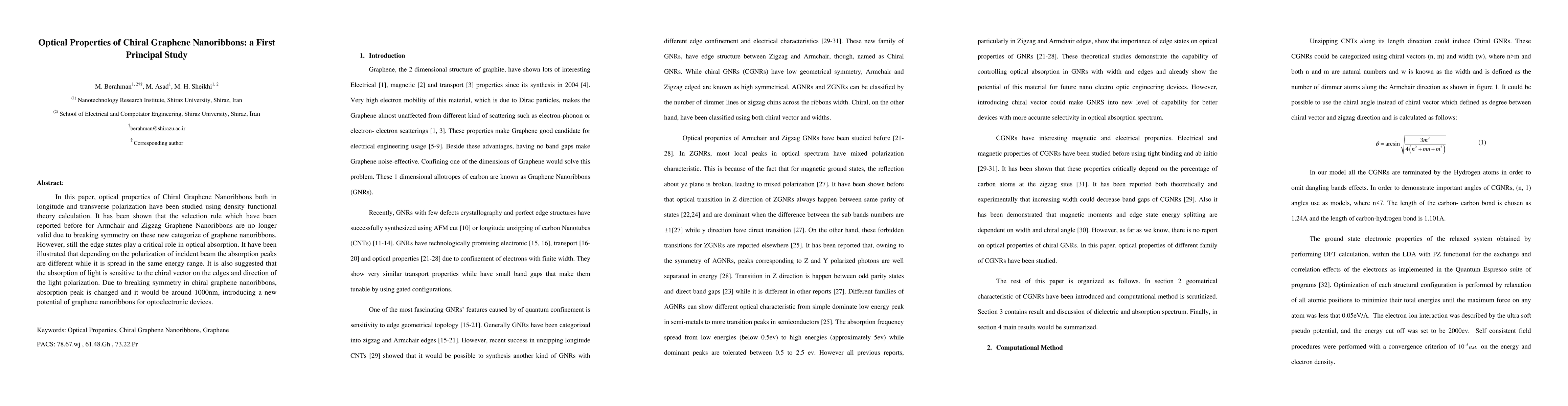 In this paper, optical properties of Chiral Graphene Nanoribbons both in longitude and transverse polarization have been studied using density functional theory calculation. It has been shown that the selection rule which have been reported before for Armchair and Zigzag Graphene Nanoribbons are no longer valid due to breaking symmetry on these new categorize of graphene nanoribbons. However, still the edge states play a critical role in optical absorption. It have been illustrated that depending on the polarization of incident beam the absorption peaks are different while it is spread in the same energy range. It is also suggested that the absorption of light is sensitive to the chiral vector on the edges and direction of the light polarization. Due to breaking symmetry in chiral graphene nanoribbons, absorption peak is changed and it would be around 1000nm, introducing a new potential of graphene nanoribbons for optoelectronic devices.