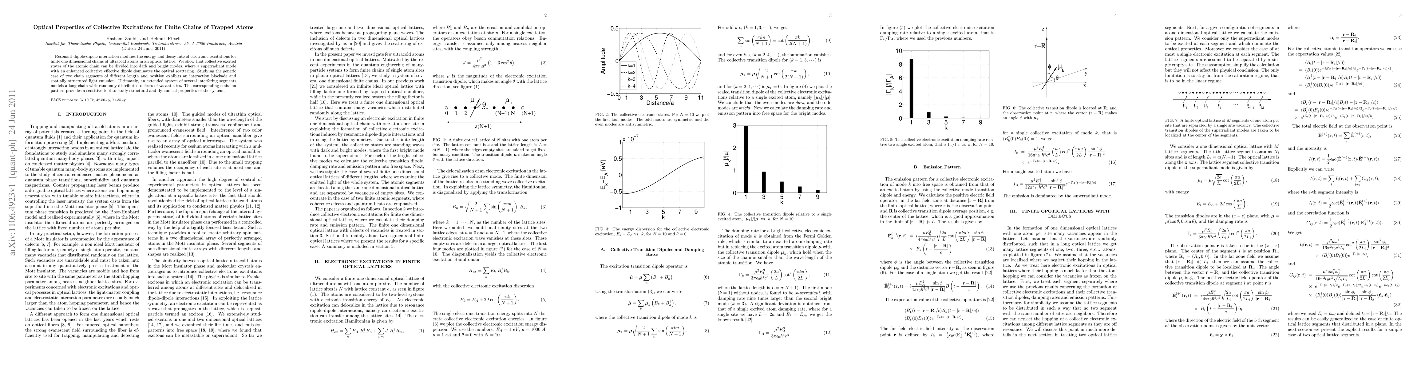 Resonant dipole-dipole interaction modifies the energy and decay rate of electronic excitations for finite one dimensional chains of ultracold atoms in an optical lattice. We show that collective excited states of the atomic chain can be divided into dark and bright modes, where a superradiant mode with an enhanced collective effective dipole dominates the optical scattering. Studying the generic case of two chain segments of different length and position exhibits an interaction blockade and spatially structured light emission. Ultimately, an extended system of several interfering segments models a long chain with randomly distributed defects of vacant sites. The corresponding emission pattern provides a sensitive tool to study structural and dynamical properties of the system.