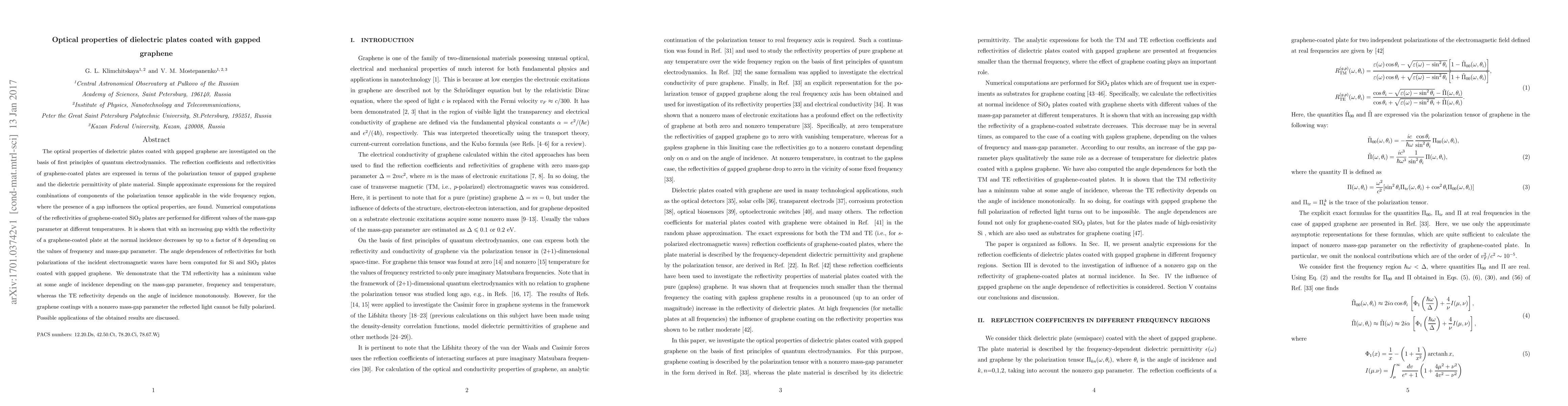This paper investigates the optical properties of dielectric plates coated with gapped graphene using quantum electrodynamics, finding that increasing the gap width reduces reflectivity by up to a factor of 8. The study also reveals that TM reflectivity has a minimum at certain angles while TE reflectivity changes monotonically, with potential applications arising from these findings.