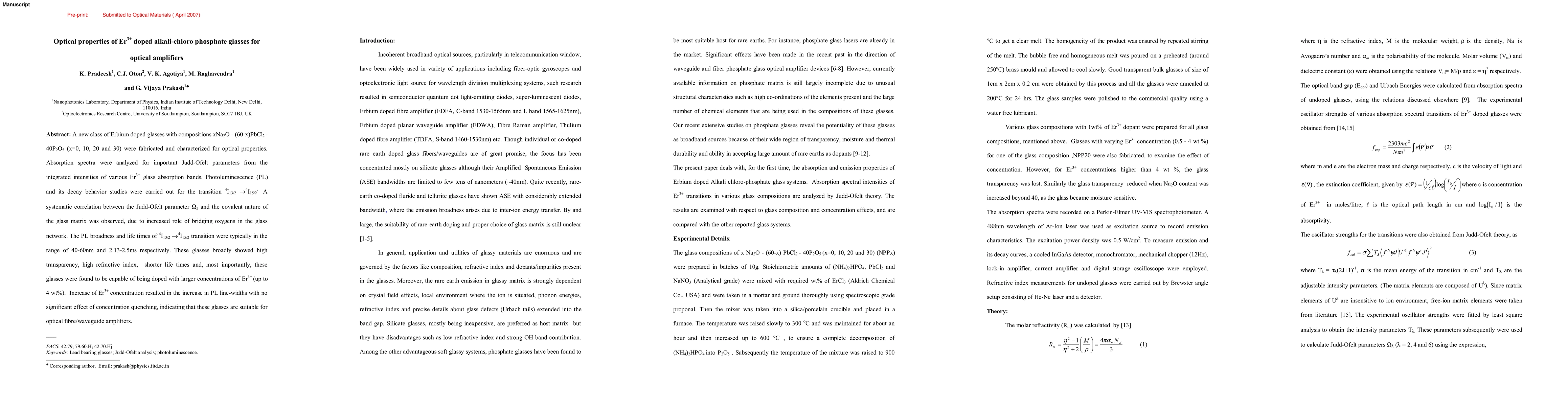 A new class of Erbium doped glasses with compositions xNa2O - (60-x)PbCl2 - 40P2O5 (x=0, 10, 20 and 30) were fabricated and characterized for optical properties. Absorption spectra were analyzed for important Judd-Ofelt parameters from the integrated intensities of various Er3+ glass absorption bands. Photoluminescence (PL) and its decay behavior studies were carried out for the transition 4I13/2 -> 4I15/2. A systematic correlation between the Judd-Ofelt parameter {omega}2 and the covalent nature of the glass matrix was observed, due to increased role of bridging oxygens in the glass network. The PL broadness and life times of 4I13/2_> 4I15/2 transition were typically in the range of 40-60nm and 2.13-2.5ms respectively. These glasses broadly showed high transparency, high refractive index, shorter life times and, most importantly, these glasses were found to be capable of being doped with larger concentrations of Er3+ (up to 4 wt%). Increase of Er3+ concentration resulted in the increase in PL line-widths with no significant effect of concentration quenching, indicating that these glasses are suitable for optical fibre/waveguide amplifiers.