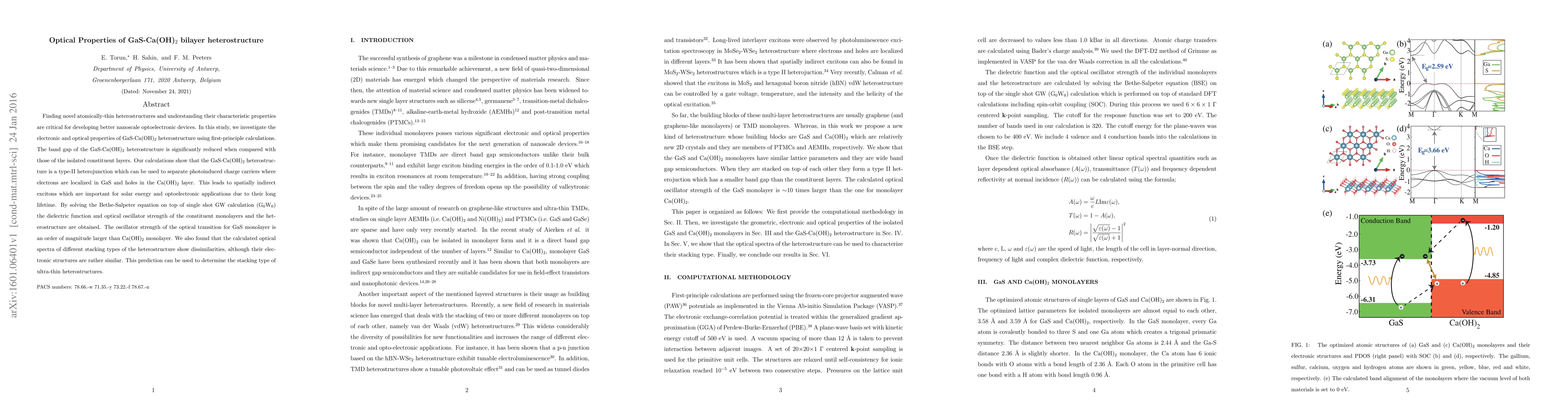 Finding novel atomically-thin heterostructures and understanding their characteristic properties are critical for developing better nanoscale optoelectronic devices. In this study, we investigate the electronic and optical properties of GaS-Ca(OH)$_2$ heterostructure using first-principle calculations. The band gap of the GaS-Ca(OH)$_2$ heterostructure is significantly reduced when compared with those of the isolated constituent layers. Our calculations show that the GaS-Ca(OH)$_2$ heterostructure is a type-II heterojunction which can be used to separate photoinduced charge carriers where electrons are localized in GaS and holes in the Ca(OH)$_2$ layer. This leads to spatially indirect excitons which are important for solar energy and optoelectronic applications due to their long lifetime. By solving the Bethe-Salpeter equation on top of single shot GW calculation (G$_0$W$_0$) the dielectric function and optical oscillator strength of the constituent monolayers and the heterostructure are obtained. The oscillator strength of the optical transition for GaS monolayer is an order of magnitude larger than Ca(OH)$_2$ monolayer. We also found that the calculated optical spectra of different stacking types of the heterostructure show dissimilarities, although their electronic structures are rather similar. This prediction can be used to determine the stacking type of ultra-thin heterostructures.