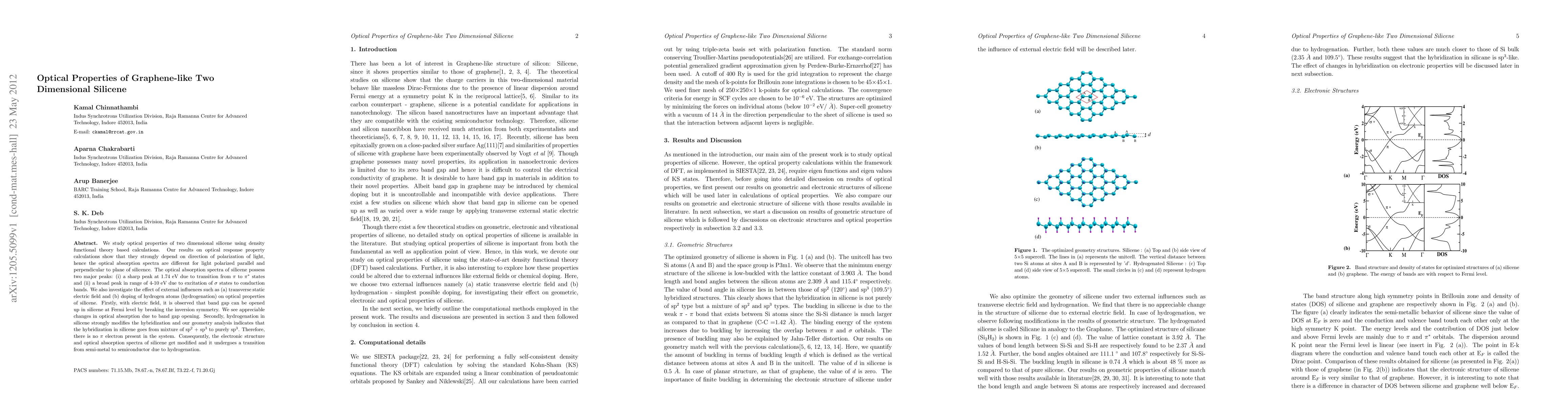 This paper investigates the optical properties of two-dimensional silicene using density functional theory, revealing polarization-dependent optical absorption spectra with major peaks at 1.74 eV and 4-10 eV. External influences such as electric fields and hydrogenation can significantly alter its optical properties, including opening a band gap and transitioning from semi-metal to semiconductor.