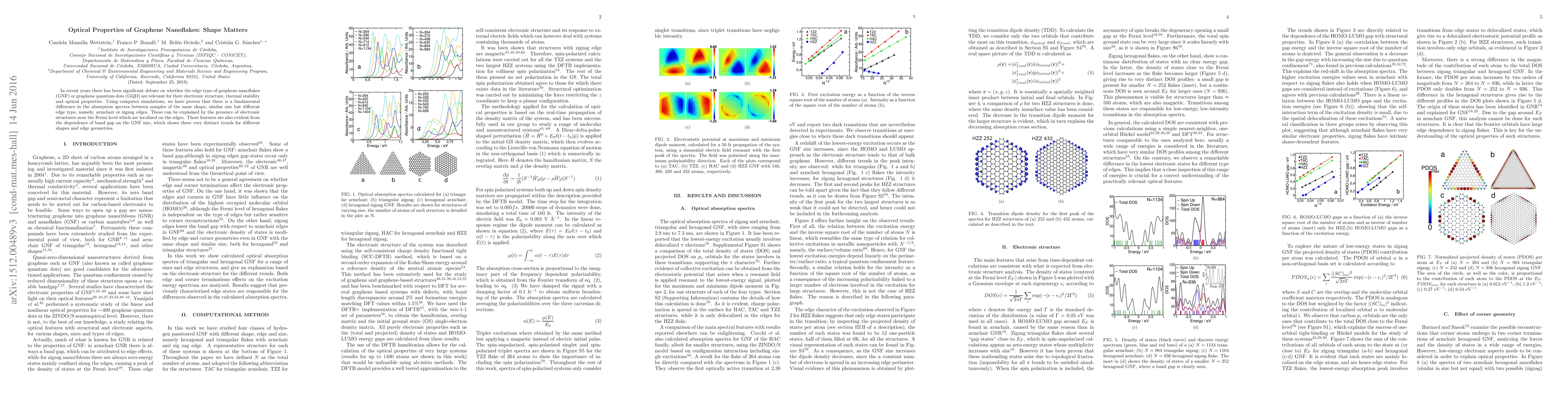 This study demonstrates that the edge type of graphene nanoflakes significantly influences their optical properties, with distinct absorption spectra observed between armchair and zigzag edges, attributable to localized electronic structures near the Fermi level. The band gap also varies distinctly with size and shape, highlighting the importance of edge geometry.