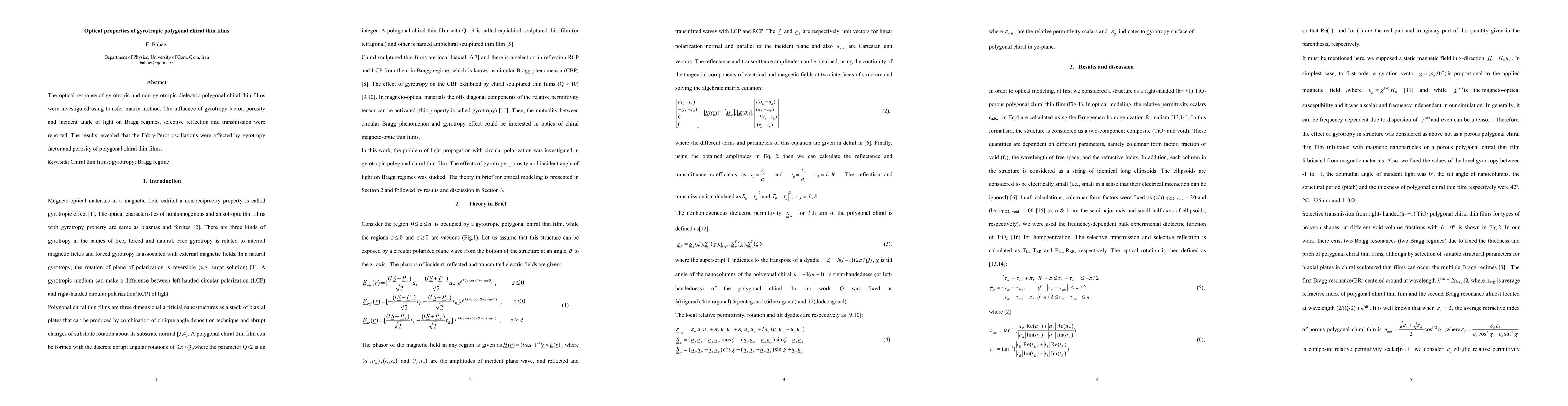 This study examines the optical behavior of chiral polygonal thin films using the transfer matrix method, finding that gyrotropy, porosity, and incident angle significantly impact Bragg regimes, selective reflection, and transmission, with Fabry-Perot oscillations notably influenced by the gyrotropy factor and film porosity.