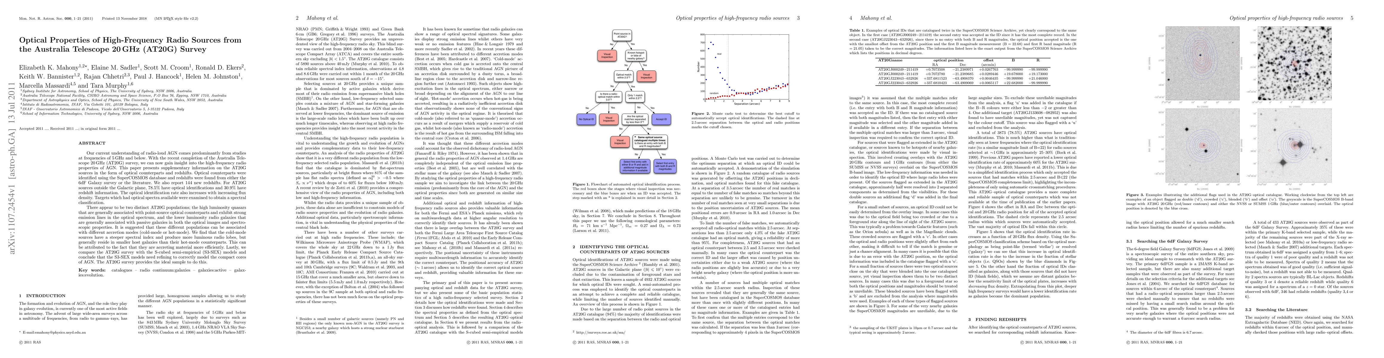 This paper investigates the optical properties of high-frequency radio sources from the AT20G survey, identifying optical counterparts and redshifts for these AGN. It reveals two distinct populations: high luminosity quasars with strong emission lines and lower luminosity radio galaxies, suggesting different accretion modes.