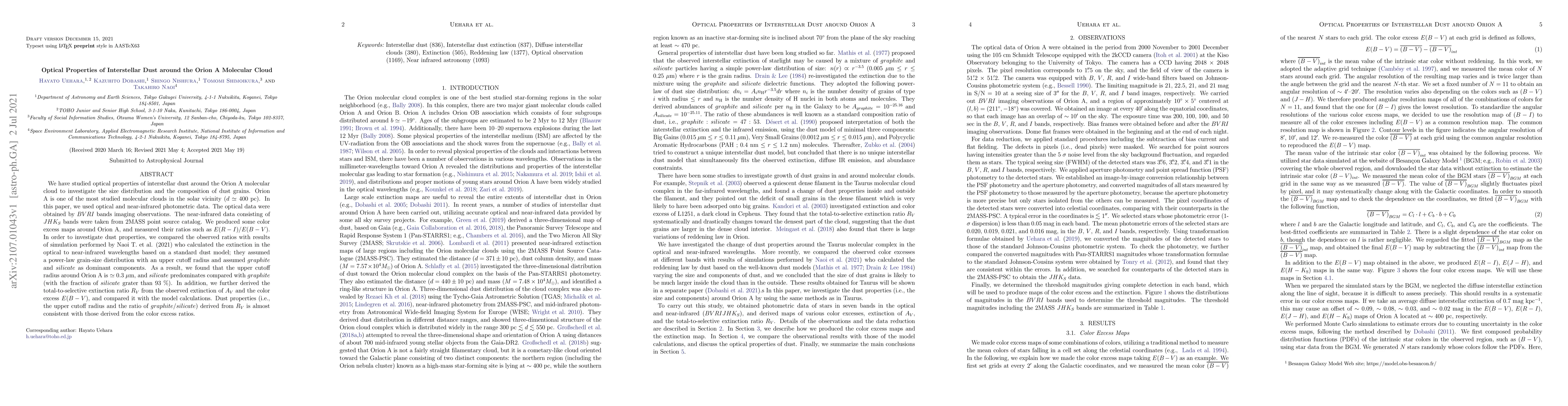 This paper investigates the optical properties of interstellar dust around the Orion A molecular cloud, using optical and near-infrared photometric data. The study finds that silicate dust predominates over graphite, with an upper cutoff radius of approximately 0.3 µm, and confirms the consistency of derived dust properties with model calculations.