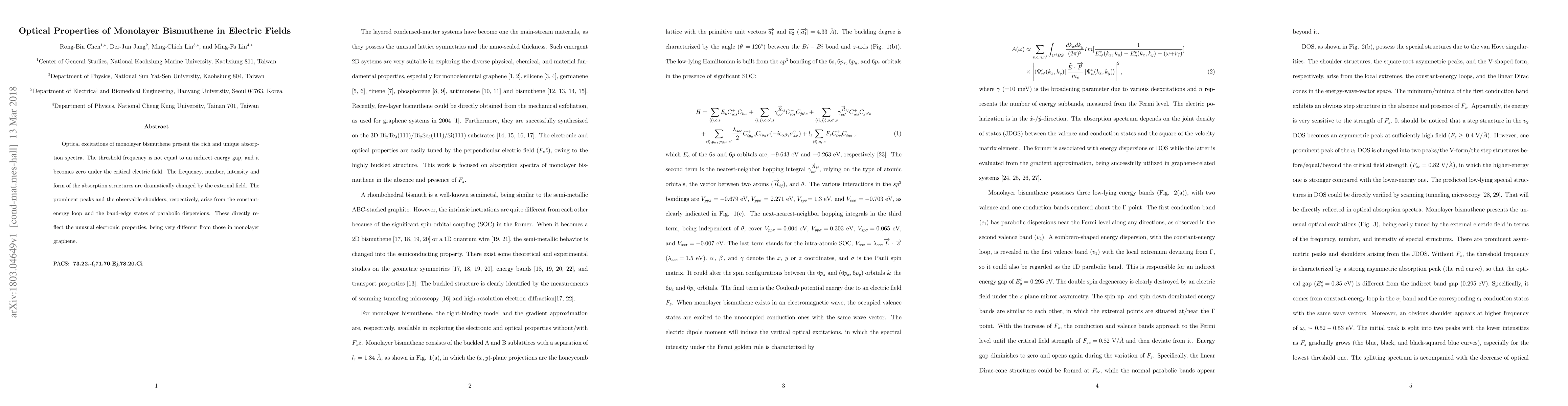 Optical excitations of monolayer bismuthene present the rich and unique absorption spectra. The threshold frequency is not equal to an indirect energy gap, and it becomes zero under the critical electric field. The frequency, number, intensity and form of the absorption structures are dramatically changed by the external field. The prominent peaks and the observable shoulders, respectively, arise from the constant-energy loop and the band-edge states of parabolic dispersions. These directly reflect the unusual electronic properties, being very different from those in monolayer graphene.