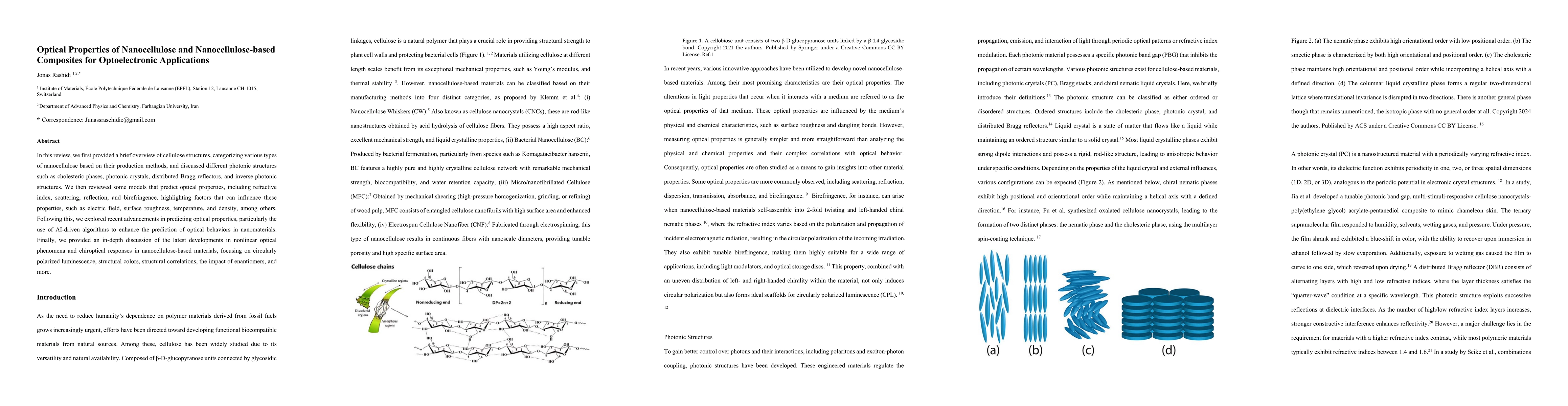 In this review, we first provided a brief overview of cellulose structures, categorizing various types of nanocellulose based on their production methods, and discussed different photonic structures such as cholesteric phases, photonic crystals, distributed Bragg reflectors, and inverse photonic structures. We then reviewed some models that predict optical properties, including refractive index, scattering, reflection, and birefringence, highlighting factors that can influence these properties, such as electric field, surface roughness, temperature, and density, among others. Following this, we explored recent advancements in predicting optical properties, particularly the use of AI-driven algorithms to enhance the prediction of optical behaviors in nanomaterials. Finally, we provided an in-depth discussion of the latest developments in nonlinear optical phenomena and chiroptical responses in nanocellulose-based materials, focusing on circularly polarized luminescence, structural colors, structural correlations, the impact of enantiomers, and more.