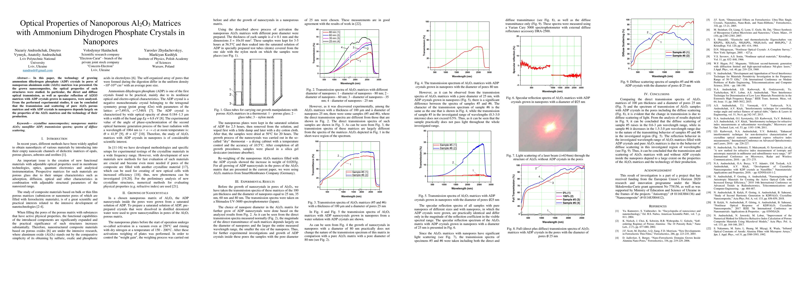 In this paper, the technology of growing ammonium dihydrogen phosphate (ADP) crystals in pores of nanoporous aluminum oxide (Al2O3) matrices was presented. On the grown nanocomposites, the optical properties of such structures were studied. In particular, the direct and diffuse optical transmission, as well as specular reflection of Al2O3 matrices with ADP crystals grown in nanopores, were analyzed. From the performed experimental studies, it can be concluded that the transmission and scattering of pure Al2O3 porous matrices and with ADP crystals in nanopores depends largely on the properties of the Al2O3 matrices and the technology of their production.
