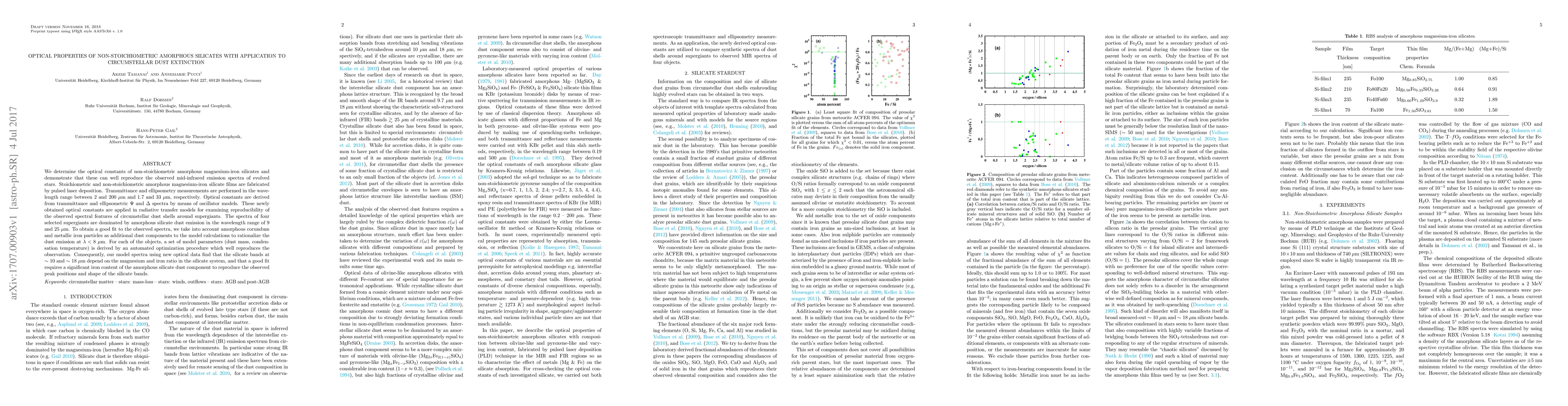 This study investigates the optical properties of non-stoichiometric amorphous magnesium-iron silicates, demonstrating their ability to reproduce mid-infrared emission spectra of evolved stars. The research finds that a significant iron content in the silicate dust is necessary to match observed spectral features of circumstellar dust shells around supergiants.
