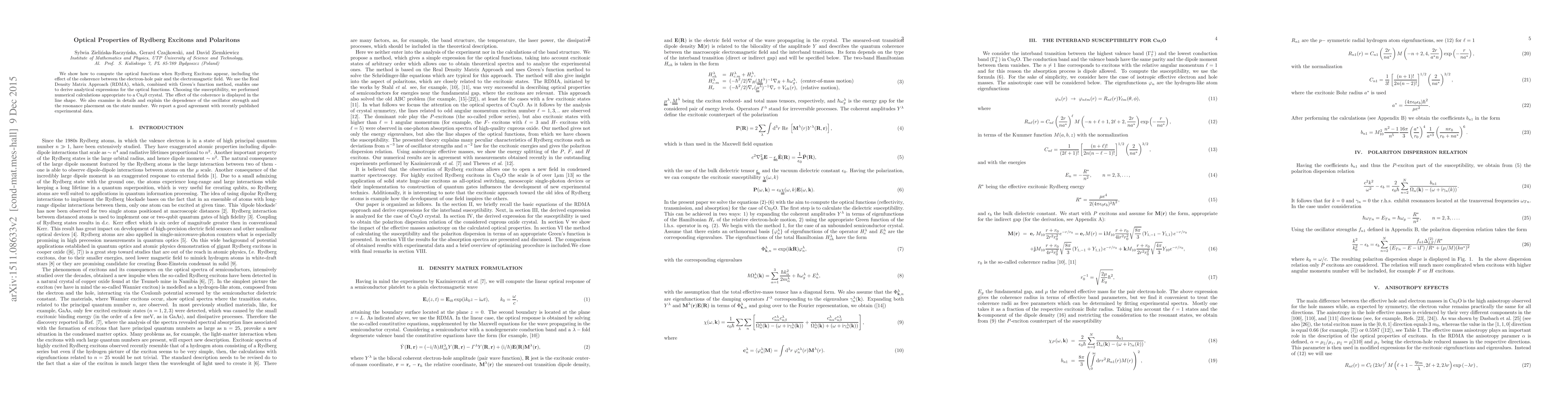 We show how to compute the optical functions when Rydberg Excitons appear, including the effect of the coherence between the electron-hole pair and the electromagnetic field. We use the Real Density Matrix Approach (RDMA), which, combined with Green's function method, enables one to derive analytical expressions for the optical functions. Choosing the susceptibility, we performed numerical calculations appropriate to a Cu$_2$0 crystal. The effect of the coherence is displayed in the line shape. We also examine in details and explain the dependence of the oscillator strength and the resonance placement on the state number. We report a good agreement with recently published experimental data.
