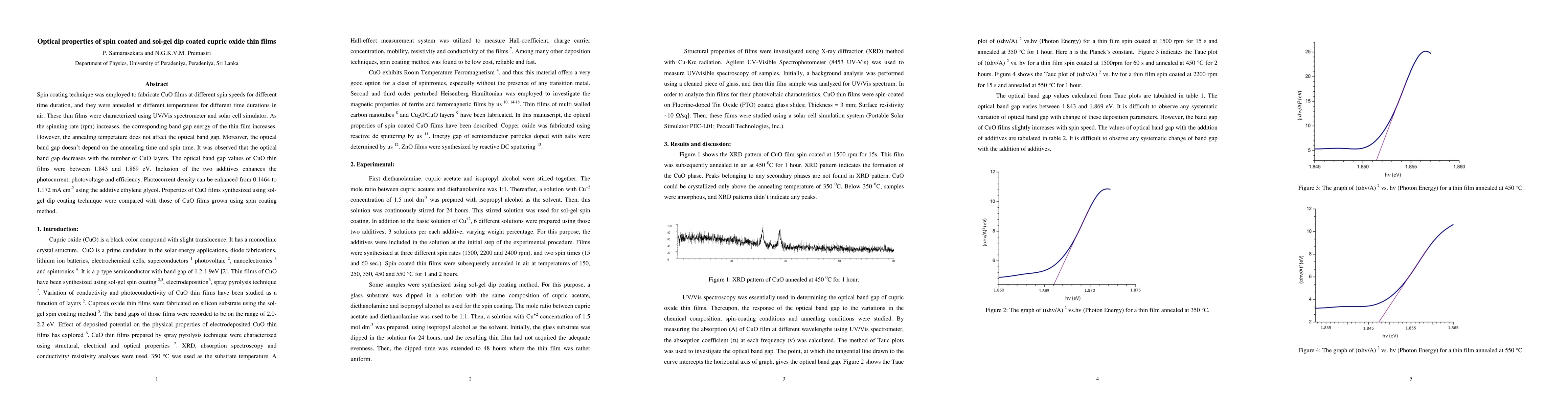 This study investigates the optical properties of CuO thin films fabricated via spin coating and sol-gel dip coating, finding that the band gap increases with spinning rate but is unaffected by annealing conditions. The addition of ethylene glycol enhances photocurrent density and efficiency.