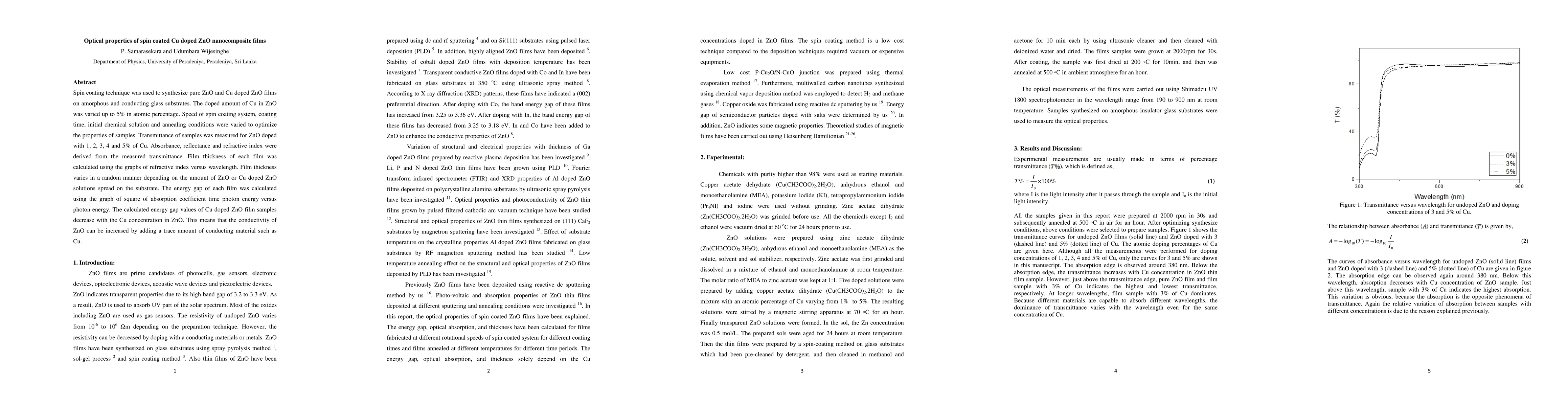 Spin coating technique was used to synthesize pure ZnO and Cu doped ZnO films on amorphous and conducting glass substrates. The doped amount of Cu in ZnO was varied up to 5% in atomic percentage. Speed of spin coating system, coating time, initial chemical solution and annealing conditions were varied to optimize the properties of samples. Transmittance of samples was measured for ZnO doped with 1, 2, 3, 4 and 5% of Cu. Absorbance, reflectance and refractive index were derived from the measured transmittance. Film thickness of each film was calculated using the graphs of refractive index versus wavelength. Film thickness varies in a random manner depending on the amount of ZnO or Cu doped ZnO solutions spread on the substrate. The energy gap of each film was calculated using the graph of square of absorption coefficient time photon energy versus photon energy. The calculated energy gap values of Cu doped ZnO film samples decrease with the Cu concentration in ZnO. This means that the conductivity of ZnO can be increased by adding a trace amount of conducting material such as Cu.