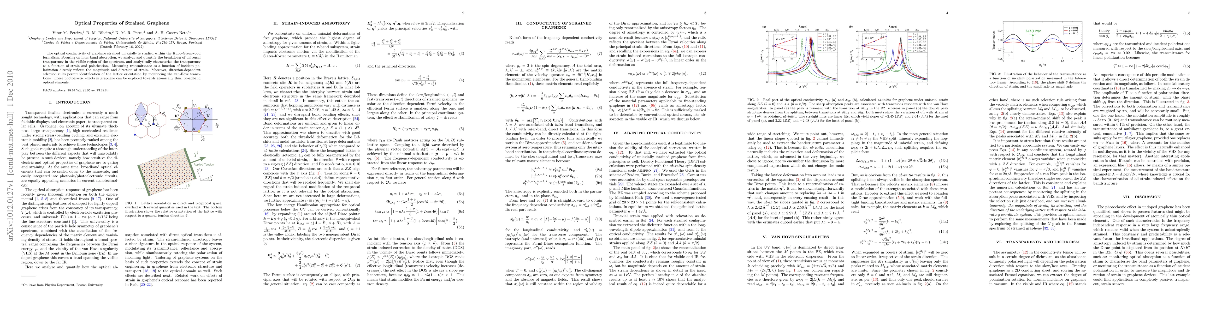 The optical conductivity of graphene strained uniaxially is studied within the Kubo-Greenwood formalism. Focusing on inter-band absorption, we analyze and quantify the breakdown of universal transparency in the visible region of the spectrum, and analytically characterize the transparency as a function of strain and polarization. Measuring transmittance as a function of incident polarization directly reflects the magnitude and direction of strain. Moreover, direction-dependent selection rules permit identification of the lattice orientation by monitoring the van-Hove transitions. These photoelastic effects in graphene can be explored towards atomically thin, broadband optical elements.