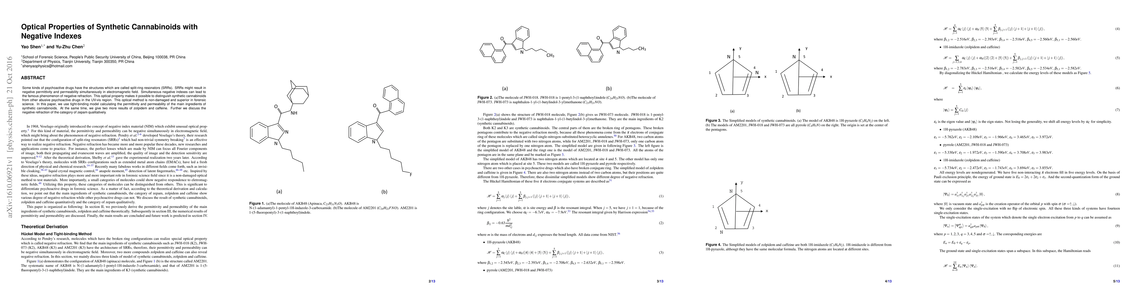 Some kinds of psychoactive drugs have the structures which are called split-ring resonators (SRRs). SRRs might result in negative permittivity and permeability simultaneously in electromagnetic field. Simultaneous negative indexes can lead to the famous phenomenon of negative refraction. This optical property makes it possible to distinguish synthetic cannabinoids from other abusive psychoactive drugs in the UV-vis region. This optical method is non-damaged and superior in forensic science. In this paper, we use tight-binding model calculating the permittivity and permeability of the main ingredients of synthetic cannabinoids. At the same time, we give two more results of zolpidem and caffeine. Further we discuss the negative refraction of the category of zepam qualitatively.