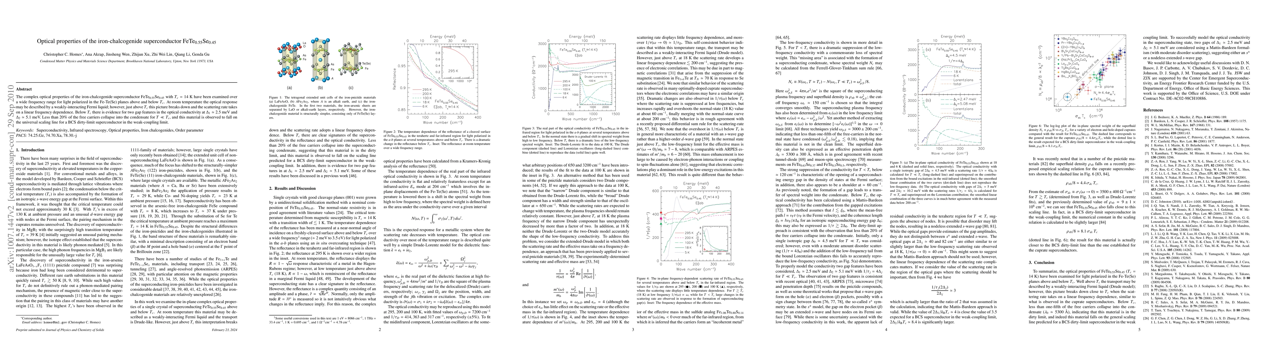 This study investigates the optical properties of the iron-chalcogenide superconductor FeTe0.55Se0.45, revealing a transition from weakly-interacting Fermi liquid behavior at room temperature to a linear frequency dependence just above Tc. Below Tc, two gap features are observed in the optical conductivity.