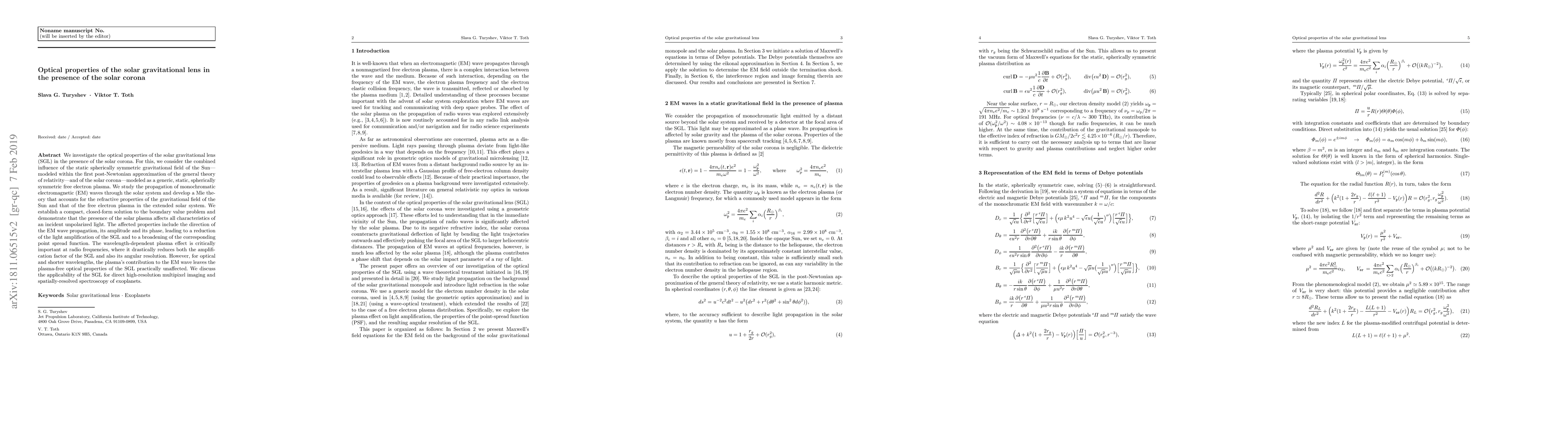 This paper investigates how the solar gravitational lens's optical properties are altered by the solar corona, modeled as a static, spherically symmetric free electron plasma. The study finds that the solar plasma significantly affects the propagation of electromagnetic waves, reducing the lens's amplification and broadening its point spread function, especially at radio frequencies. For optical wavelengths, the plasma's impact is negligible.