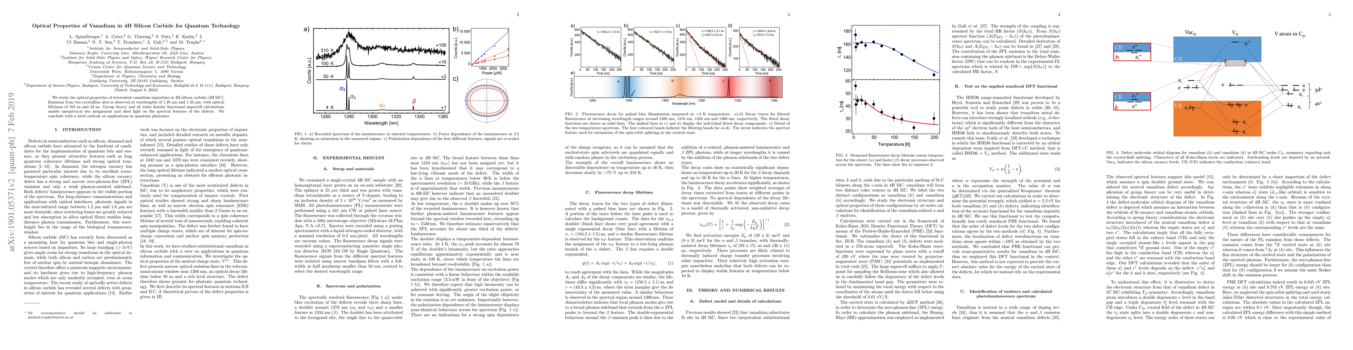 This study investigates the optical properties of vanadium impurities in 4H silicon carbide, revealing emissions at 1.28 µm and 1.33 µm with distinct lifetimes. Advanced calculations confirm the crystalline sites and potential applications in quantum photonics.