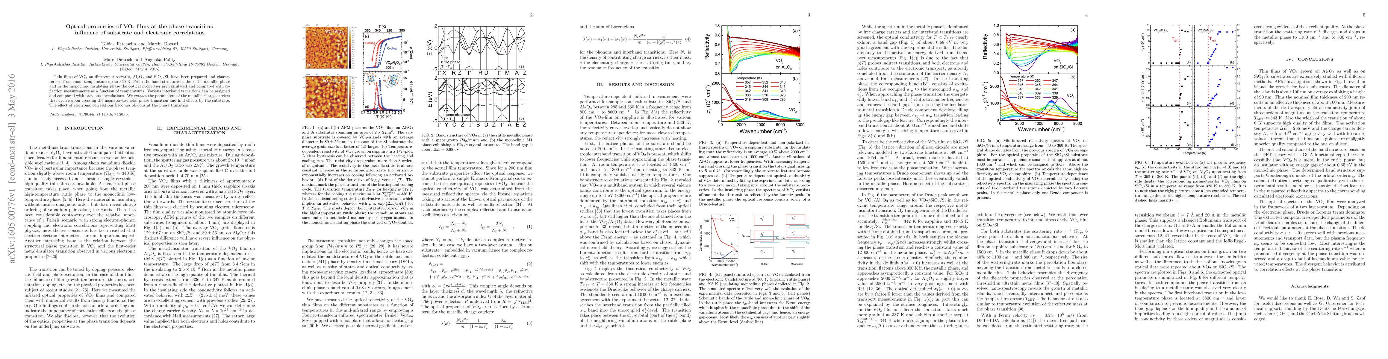 Thin films of VO$_2$ on different substrates, Al$_2$O$_3$ and SiO$_2$/Si, have been prepared and characterized from room temperature up to 360 K. From the band structure in the rutile metallic phase and in the monoclinic insulating phase the optical properties are calculated and compared with reflection measurements as a function of temperatures. Various interband transitions can be assigned and compared with previous speculations. We extract the parameters of the metallic charge carriers that evolve upon crossing the insulator-to-metal phase transition and find effects by the substrate. The effect of electronic correlations becomes obvious at the phase transition.
