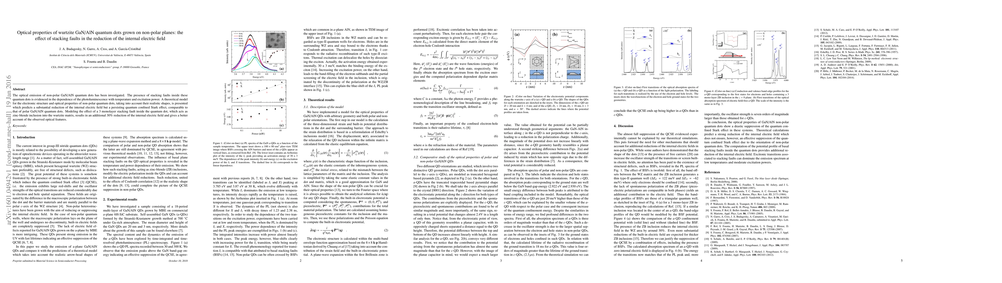 This paper investigates the optical properties of non-polar GaN/AlN quantum dots, revealing that stacking faults reduce the internal electric field, though the quantum confined Stark effect remains. A theoretical model shows a 30% further reduction in the internal electric field due to a 3 monolayer stacking fault, aligning well with observed photoluminescence characteristics.