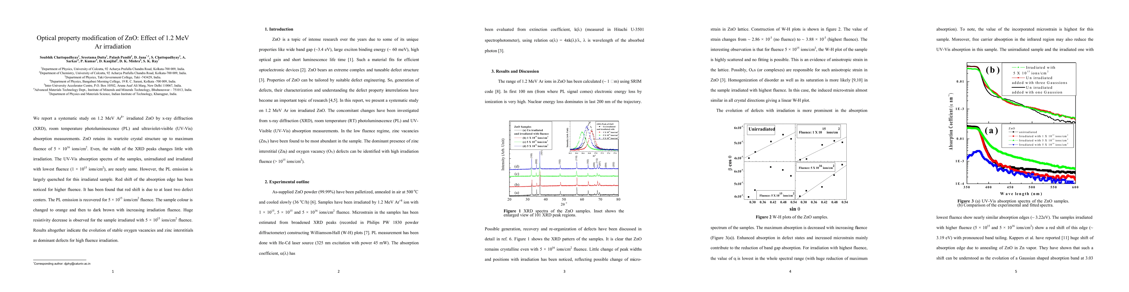 This study investigates the optical property changes in ZnO due to 1.2 MeV Ar irradiation, revealing stable oxygen vacancies and zinc interstitials as dominant defects at high fluence, leading to a red shift in absorption and significant resistivity decrease.