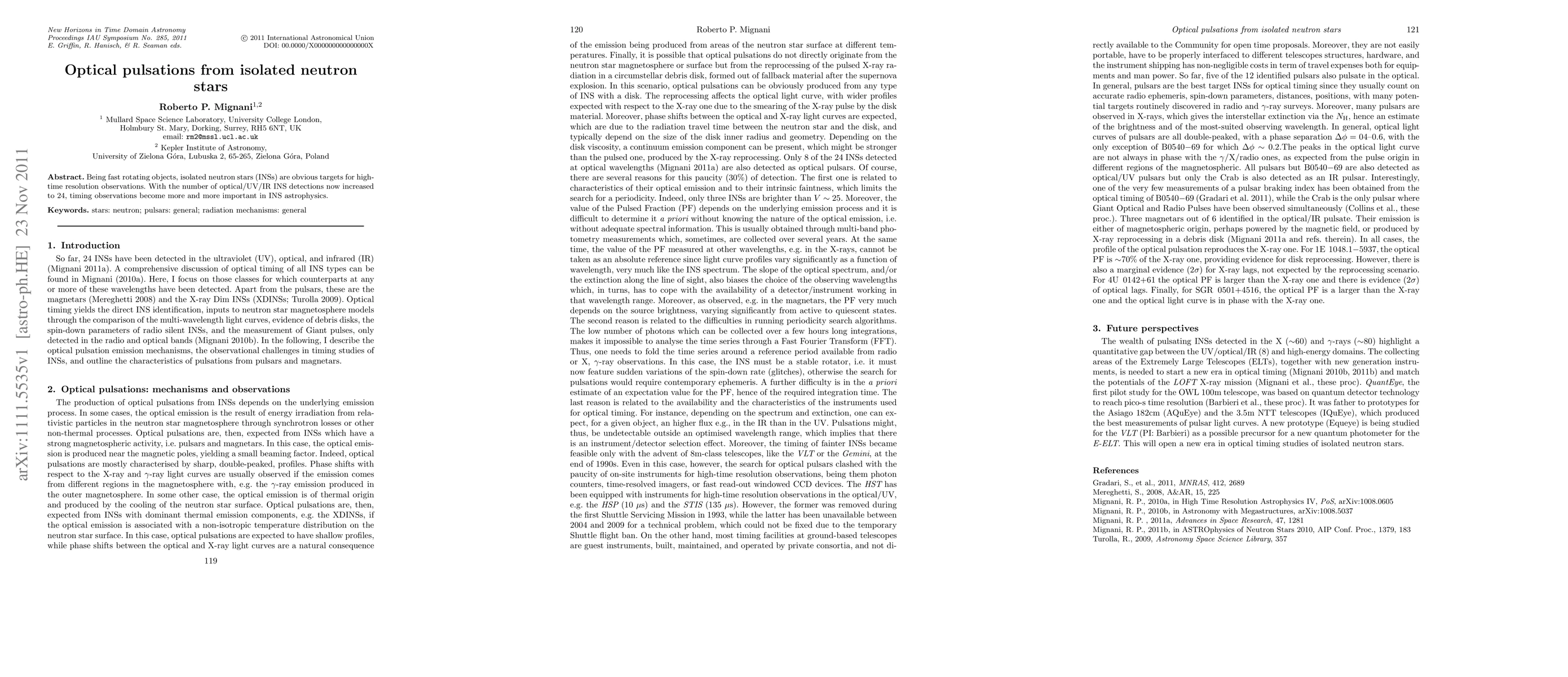 This paper investigates the optical pulsations from isolated neutron stars (INSs), emphasizing their significance as fast rotators for high-time resolution observations. With the growing number of INS detections, timing observations are becoming crucial for advancing INS astrophysics.