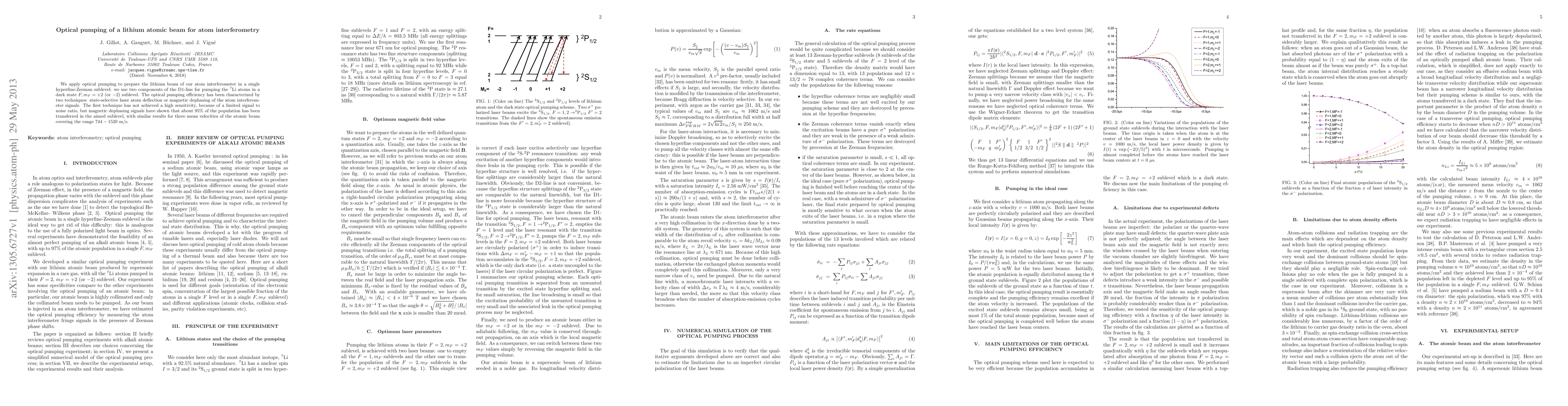 This paper details the optical pumping technique used to prepare a lithium atomic beam for atom interferometry, achieving about 95% efficiency in transferring atoms to the desired hyperfine-Zeeman sublevel. Magnetic dephasing signals confirm the high efficiency across a range of atomic beam velocities.
