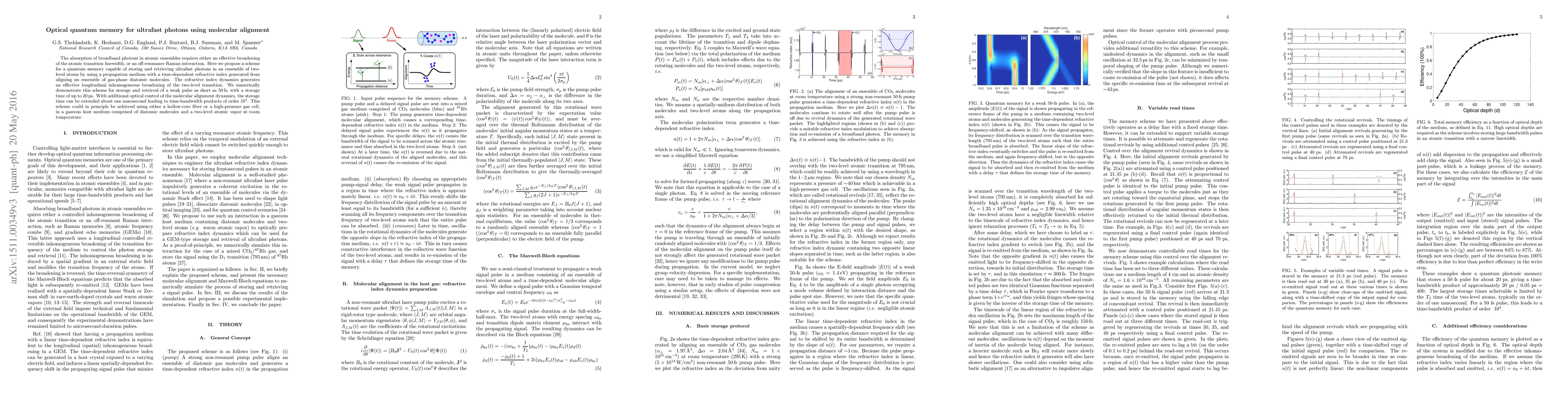 This paper proposes a quantum memory scheme using aligned gas-phase diatomic molecules to store ultrafast photons in atomic ensembles, achieving effective longitudinal broadening and demonstrating storage of 50 fs pulses up to 20 ps, with potential for extending storage time to a nanosecond.