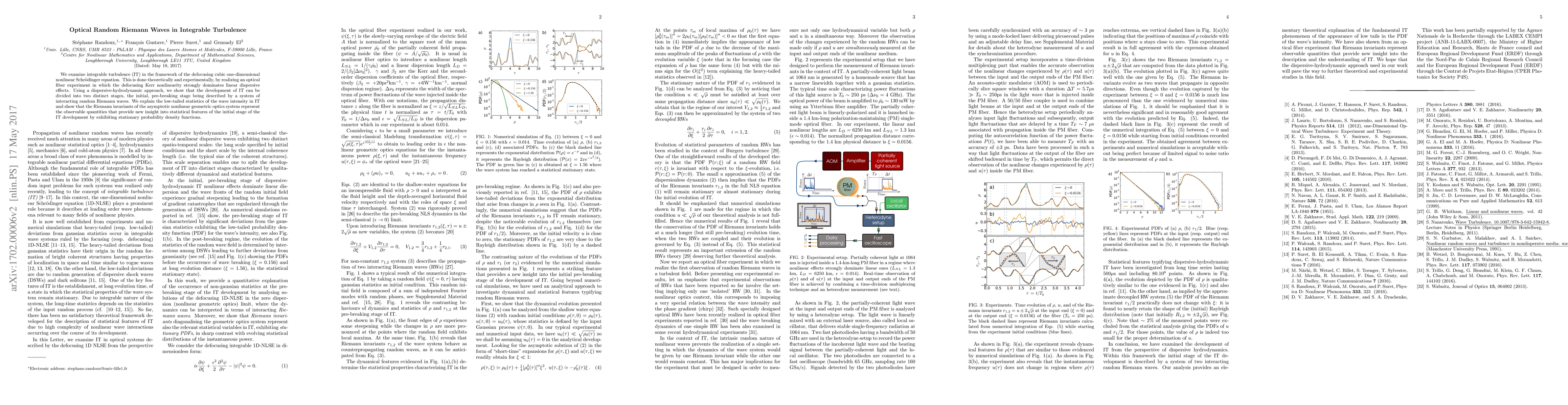 This paper investigates integrable turbulence in optical fibers using the defocusing cubic nonlinear Schrödinger equation, demonstrating two-stage development through interacting random Riemann waves. Experimental and theoretical results reveal low-tailed statistics of wave intensity, with Riemann invariants providing insight into the initial stage's statistical features.