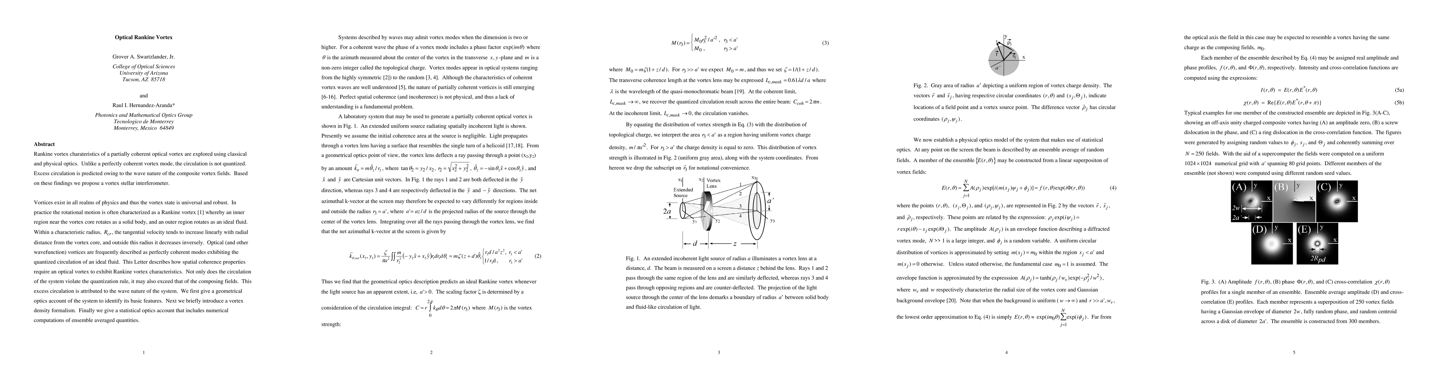 Rankine vortex charateristics of a partially coherent optical vortex are explored using classical and physical optics. Unlike a perfectly coherent vortex mode, the circulation is not quantized. Excess circulation is predicted owing to the wave nature of the composite vortex fields. Based on these findings we propose a vortex stellar interferometer.