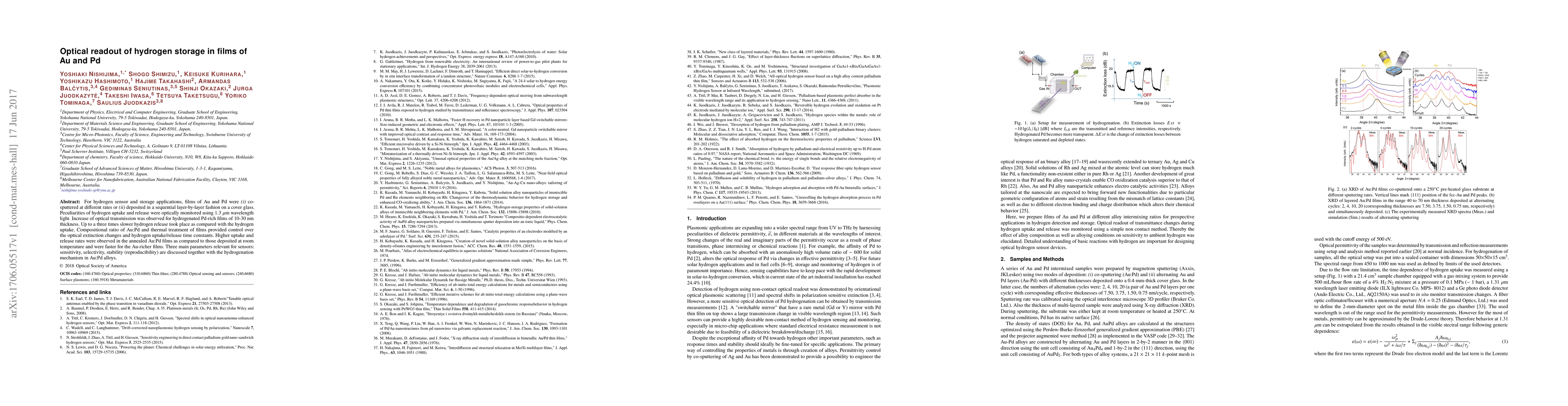 For hydrogen sensor and storage applications, films of Au and Pd were (i) co-sputtered at different rates or (ii) deposited in a sequential layer-by-layer fashion on a cover glass. Peculiarities of hydrogen uptake and release were optically monitored using 1.3 micrometers wavelength light. Increase of optical transmission was observed for hydrogenated Pd-rich films of 10-30 nm thickness. Up to a three times slower hydrogen release took place as compared with the hydrogen uptake. Composition ratio of Au:Pd and thermal treatment of films provided control over the optical extinction changes and hydrogen uptake/release time constants. Higher uptake and release rates were observed in the annealed Au:Pd films as compared to those deposited at room temperature and were faster for the Au-richer films. Three main parameters relevant for sensors: sensitivity, selectivity, stability (reproducibility) are discussed together with the hydrogenation mechanism in Au:Pd alloys.