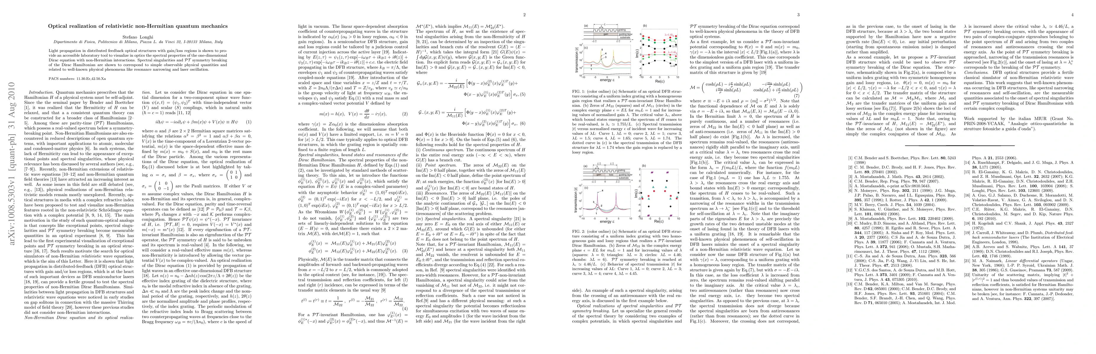 This paper demonstrates how optical structures with gain/loss regions can simulate the spectral properties of relativistic non-Hermitian quantum mechanics, revealing spectral singularities and PT symmetry breaking through observable phenomena like resonance narrowing and laser oscillation.
