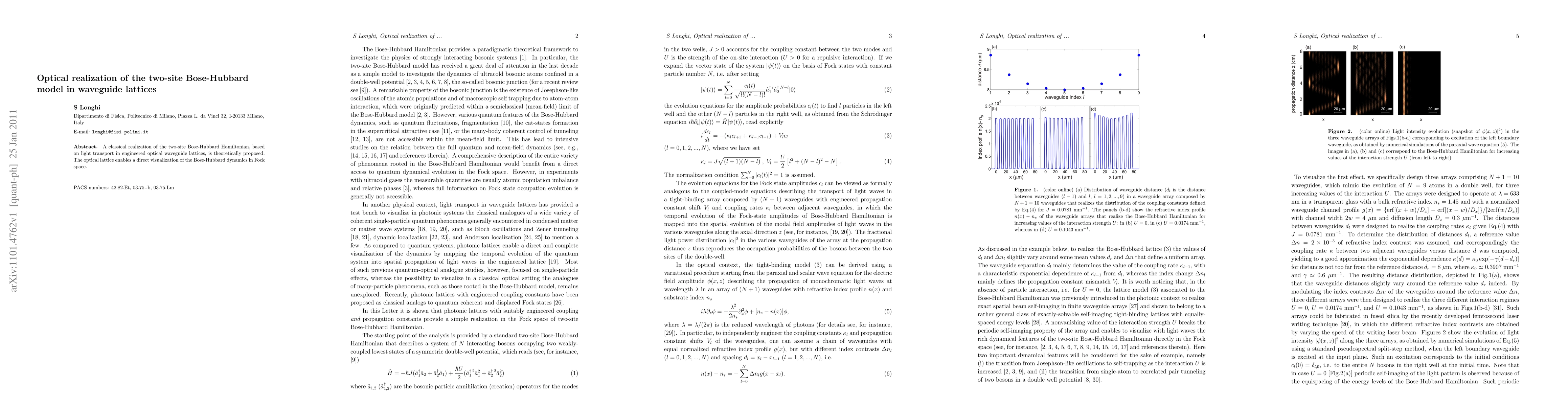 This paper proposes a classical optical realization of the two-site Bose-Hubbard model using engineered optical waveguide lattices, enabling direct visualization of the dynamics in Fock space. The study highlights the potential for optical systems to simulate quantum mechanical phenomena.