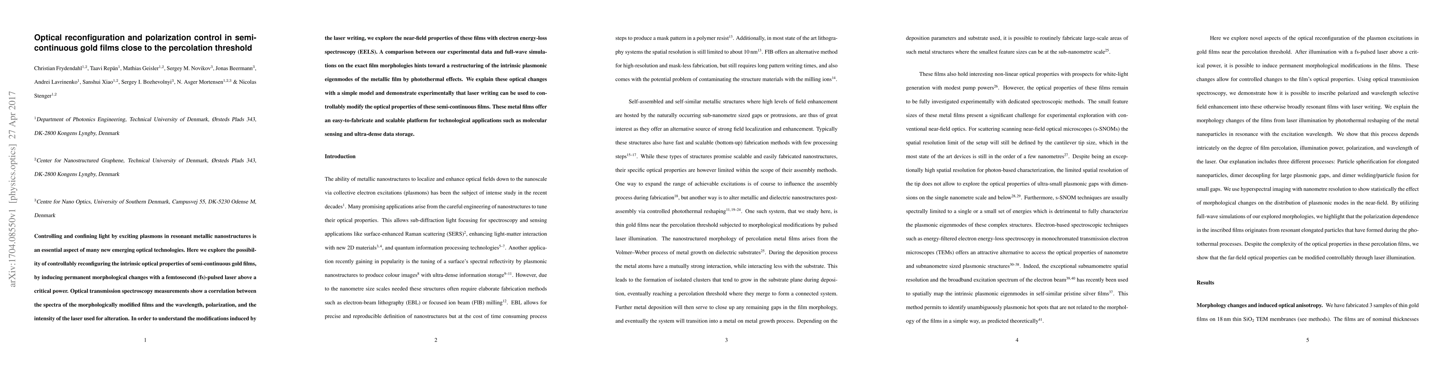 This research demonstrates the use of femtosecond laser pulses to permanently alter the optical properties of semi-continuous gold films, enabling controllable reconfiguration and polarization control. The method, supported by full-wave simulations and EELS analysis, shows promise for applications in molecular sensing and ultra-dense data storage due to its scalability and ease of fabrication.