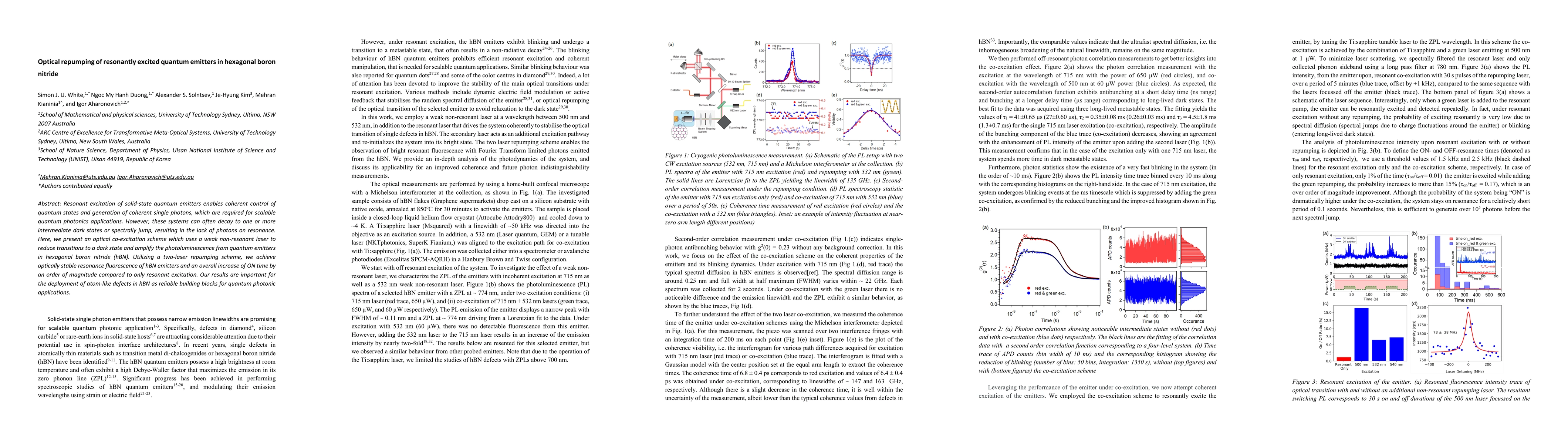 The paper presents an optical co-excitation scheme using a weak non-resonant laser to reduce dark state transitions and enhance photoluminescence in quantum emitters in hexagonal boron nitride, achieving stable resonance fluorescence and a tenfold increase in ON time for quantum photonic applications.