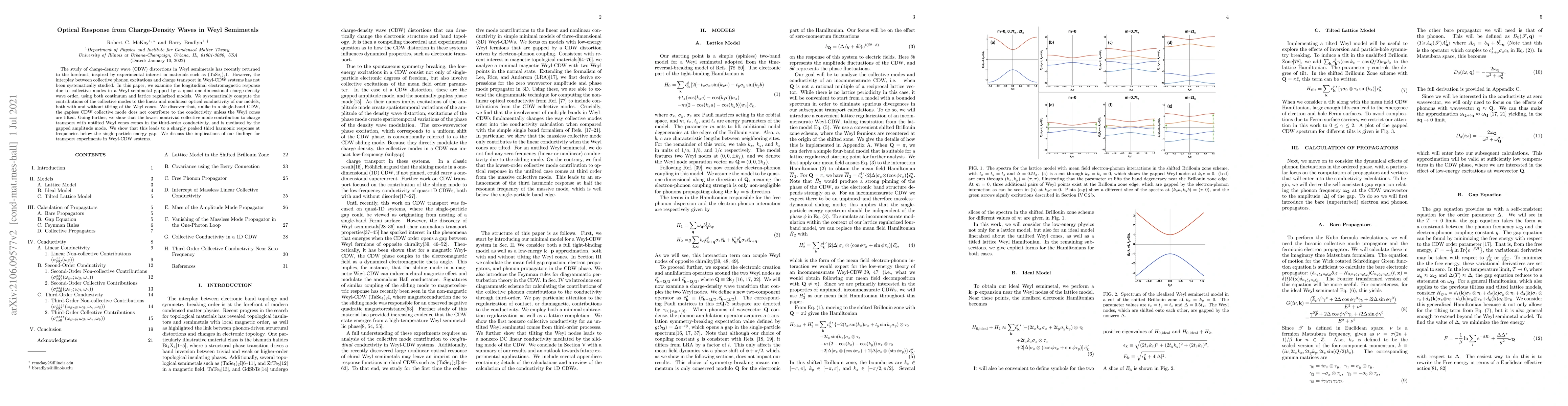 This paper investigates the optical response in Weyl semimetals with charge-density wave distortions, revealing that the gapless CDW collective mode only impacts conductivity when Weyl cones are tilted. It finds that the third-order conductivity, mediated by a gapped amplitude mode, leads to a sharply peaked third harmonic response below the single-particle energy gap.