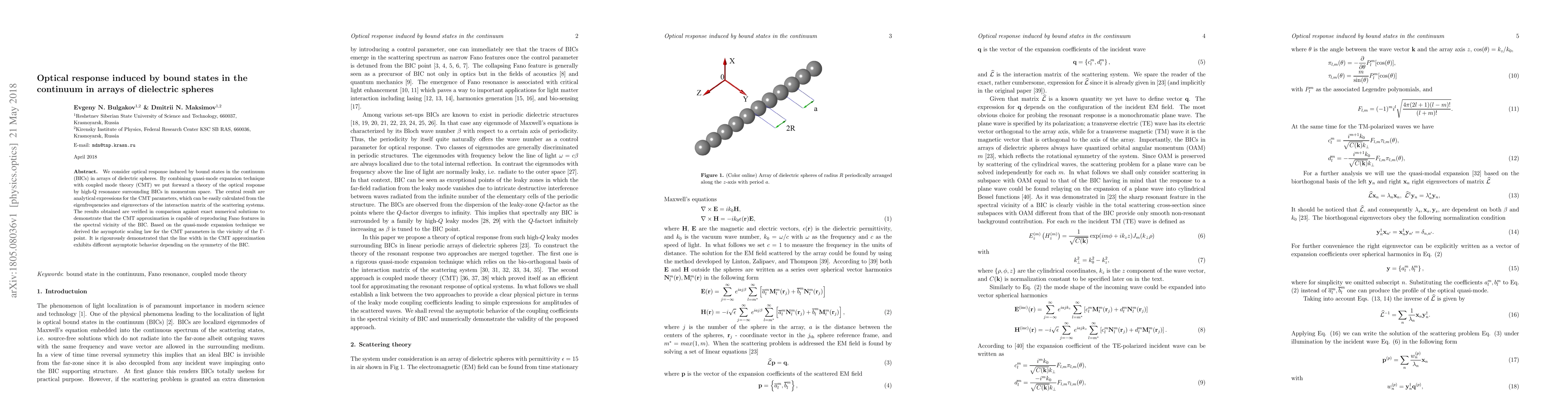 We consider optical response induced by bound states in the continuum (BICs) in arrays of dielectric spheres. By combining quasi-mode expansion technique with coupled mode theory (CMT) we put forward a theory of the optical response by high-Q resonance surrounding BICs in momentum space. The central result are analytical expressions for the CMT parameters, which can be easily calculated from the eigenfrequencies and eigenvectors of the interaction matrix of the scattering systems. The results obtained are verified in comparison against exact numerical solutions to demonstrate that the CMT approximation is capable of reproducing Fano features in the spectral vicinity of the BIC. Based on the quasi-mode expansion technique we derived the asymptotic scaling law for the CMT parameters in the vicinity of the $\Gamma$-point. It is rigorously demonstrated that the line width in the CMT approximation exhibits different asymptotic behaviour depending on the symmetry of the BIC.