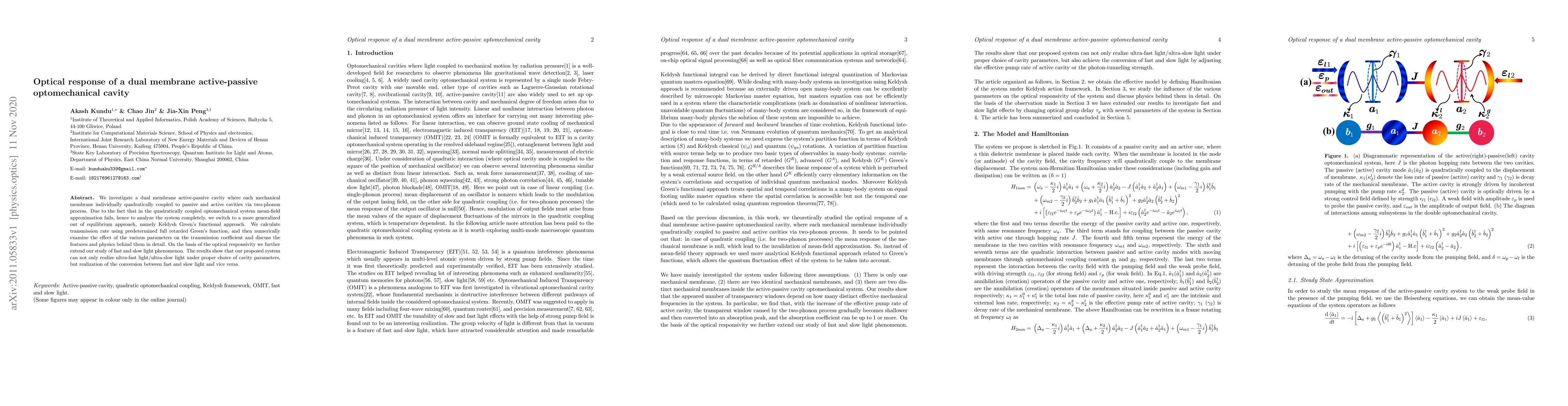 This paper explores a dual membrane optomechanical cavity with each membrane quadratically coupled to passive and active cavities. Using the Keldysh Green's functional approach, the study investigates the optical response, transmission rate, and optical responsivity, revealing the potential for ultra-fast and ultra-slow light, as well as the conversion between these states.