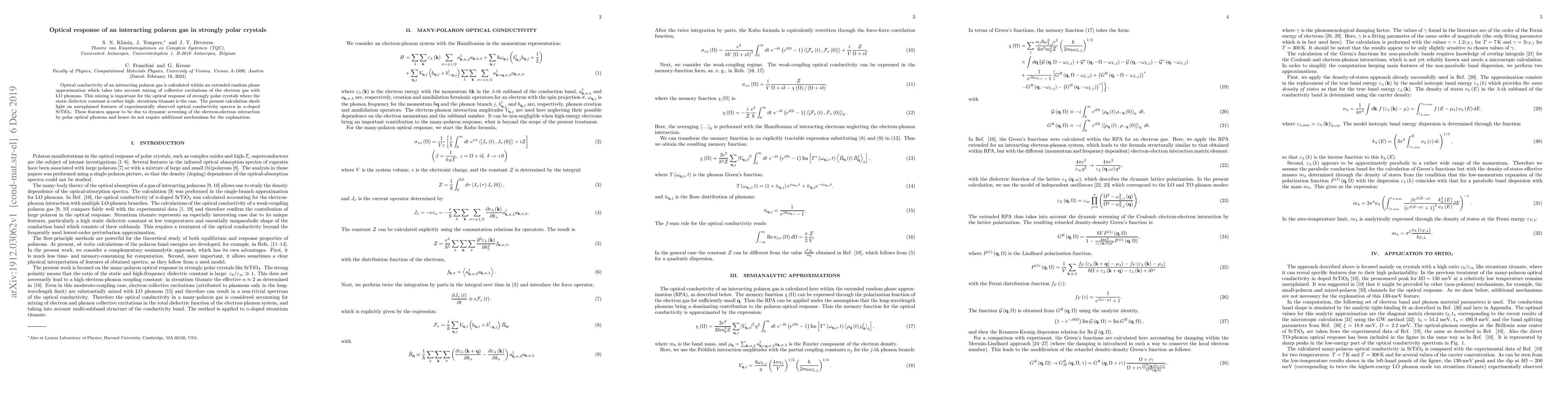 This paper calculates the optical conductivity of an interacting polaron gas in strongly polar crystals using an extended random phase approximation, revealing that dynamic screening of electron-electron interactions by optical phonons explains observed features in the optical conductivity spectra of $n$-doped SrTiO$_{3}$ without needing additional mechanisms.