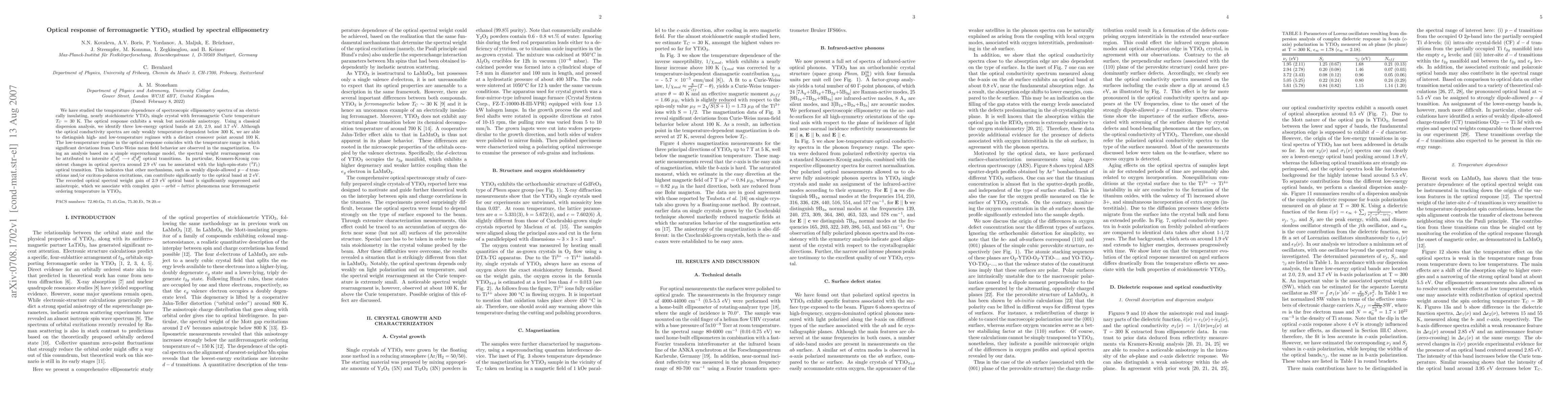 We have studied the temperature dependence of spectroscopic ellipsometry spectra of an electrically insulating, nearly stoichiometric YTiO_3 single crystal with ferromagnetic Curie temperature T_C = 30 K. The optical response exhibits a weak but noticeable anisotropy. Using a classical dispersion analysis, we identify three low-energy optical bands at 2.0, 2.9, and 3.7 eV. Although the optical conductivity spectra are only weakly temperature dependent below 300 K, we are able to distinguish high- and low-temperature regimes with a distinct crossover point around 100 K. The low-temperature regime in the optical response coincides with the temperature range in which significant deviations from Curie-Weiss mean field behavior are observed in the magnetization. Using an analysis based on a simple superexchange model, the spectral weight rearrangement can be attributed to intersite d_i^1d_j^1 \longrightarrow d_i^2d_j^0 optical transitions. In particular, Kramers-Kronig consistent changes in optical spectra around 2.9 eV can be associated with the high-spin-state (^3T_1) optical transition. This indicates that other mechanisms, such as weakly dipole-allowed p-d transitions and/or exciton-polaron excitations, can contribute significantly to the optical band at 2 eV. The recorded optical spectral weight gain of 2.9 eV optical band is significantly suppressed and anisotropic, which we associate with complex spin-orbit-lattice phenomena near ferromagnetic ordering temperature in YTiO_3.